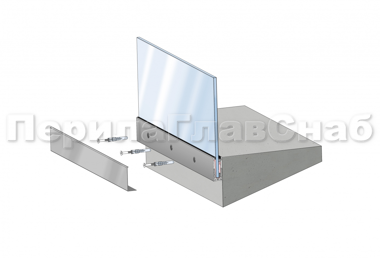 Профиль крепится на горизонтальную поверхность через отверстия просверленные в нижней части профиля. Также профиль может быть смонтирован к боковой поверхности. Стекло вставляется сверху, зажимается распорными клиньями через уплотнительные резиновые прокладки. монтажный паз профиля закрывается резиновой накладкой. Накладки под любую толщину стекла - от 10 до 16мм входят в комплект поставки. Дополнительно можно приобрести декоративные накладки из полированной стали и торцевые заглушки.