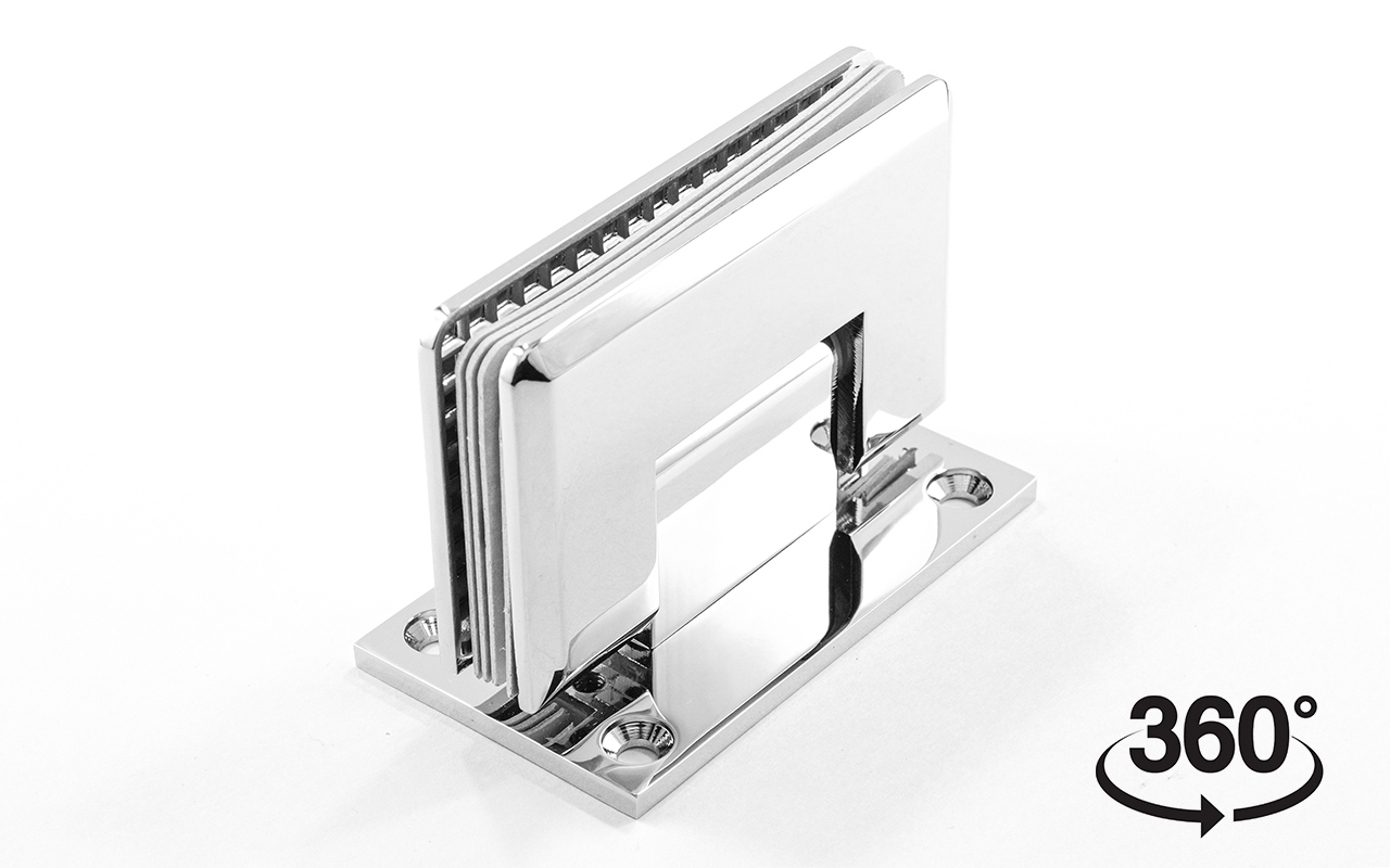 Петля из нержавеющей стали с полированной поверхностью из нержавеющей стали предназначена для стыковки между собой конструкционных элементов из стекла, толщина которых находится в диапазоне от 8 до 10 мм. Максимальный вес двери на 2 петли составляет 45 кг. В конструкции заложена система скрытого крепежа. Имеет функцию доводчика до закрытия от 25°. Максимальный угол разведения стыковочных элементов в плане составляет 90°. Крепление предусмотрено с двух сторон на 4 винта со шляпками заподлицо (по 2 винта на каждую сторону). Размер одной стороны петли составляет 90х55 мм.