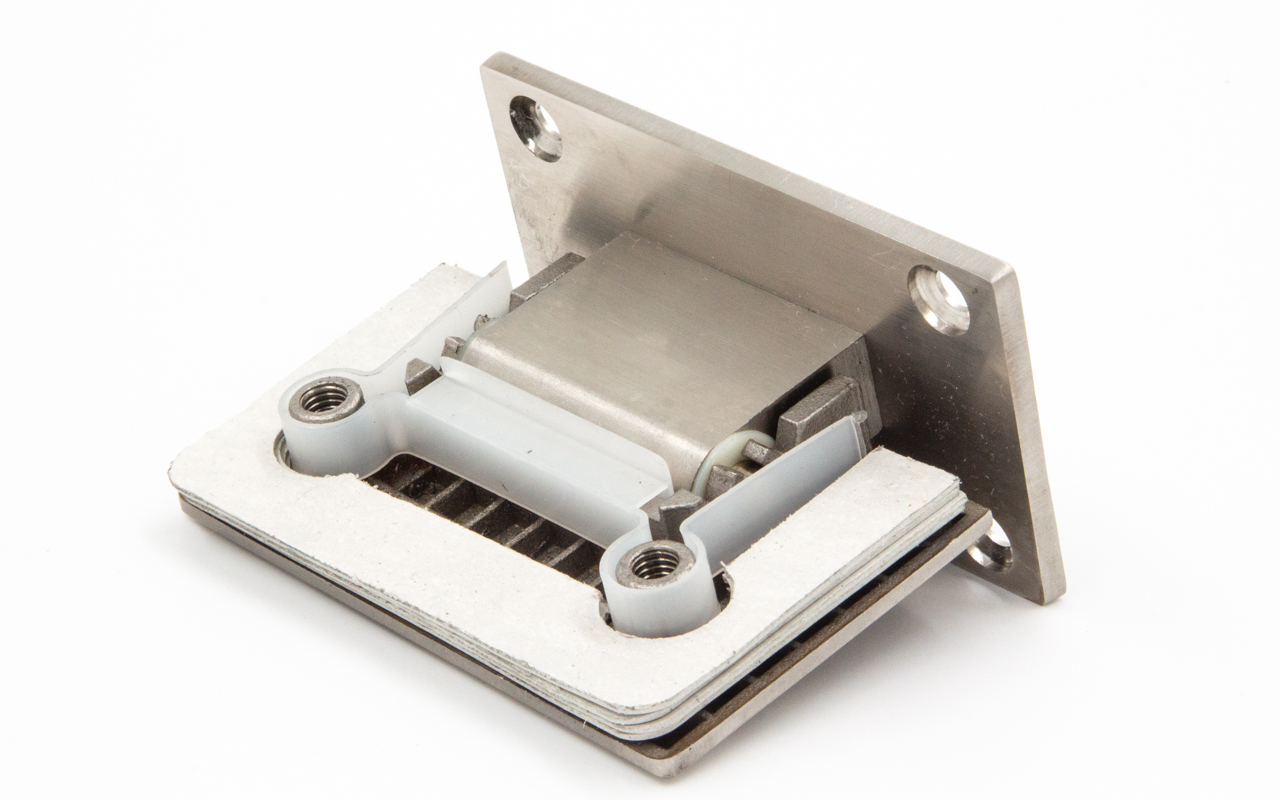 Петля из нержавеющей стали со шлифованной поверхностью из нержавеющей стали предназначена для стыковки между собой конструкционных элементов из стекла, толщина которых находится в диапазоне от 8 до 10 мм. Максимальный вес двери на 2 петли составляет 45 кг. В конструкции заложена система скрытого крепежа. Имеет функцию доводчика до закрытия от 25°. Максимальный угол разведения стыковочных элементов в плане составляет 90°.