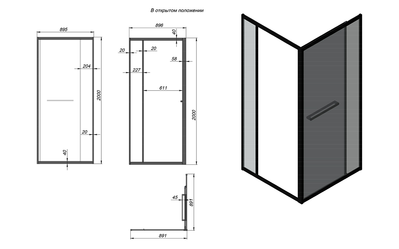 Комплект душевой с внутренней подвижной дверью, толщина стекла 8мм, 900х900х2000, aisi 304, полированная t470 PSS