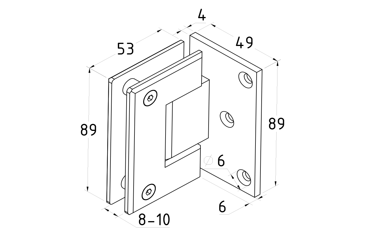 Петля для душевой кабины стена-стекло 90° с односторонним креплением, 90*55, материал - цинк, вырез 51