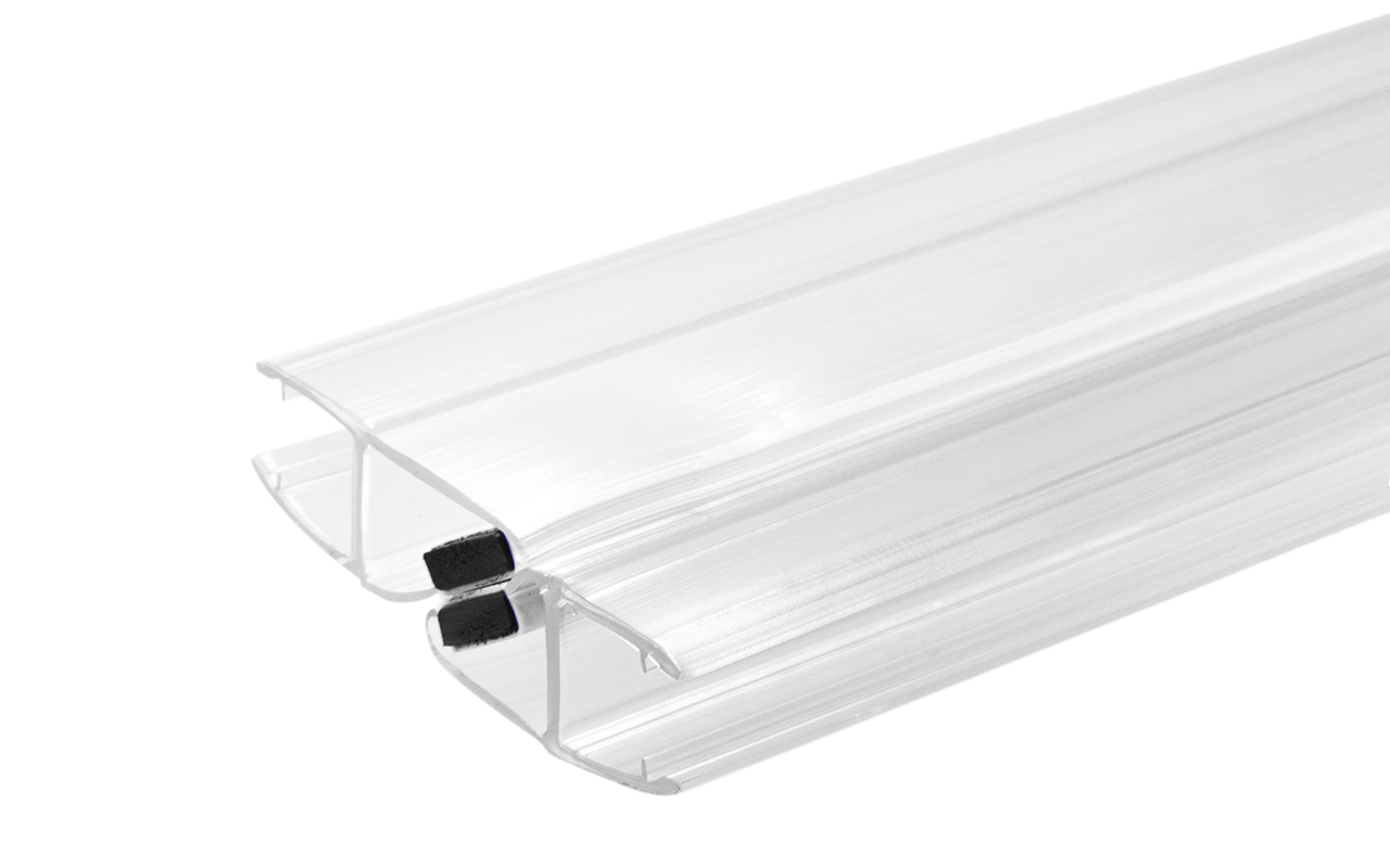 Комплект из двух профилей с магнитом. Монтируется по всему периметру стеклянного листа. Позволяет герметично соединять стеклянные панели между собой благодаря встроенному магниту. Толщина одного типоразмера составляет 1.5 мм, длина – 2200 мм. За счет своих свойств (стойкость к щелочам, минеральным маслам и многим кислотам) прекрасно подходит для крепления стеклянного листа по всему периметру. Применение этого комплекта гарантирует отсутствие течи в вертикальной части конструкции. Уплотнитель из комплекта применим в сочетании со стеклом толщиной до 8 мм и углом в плане до 135.