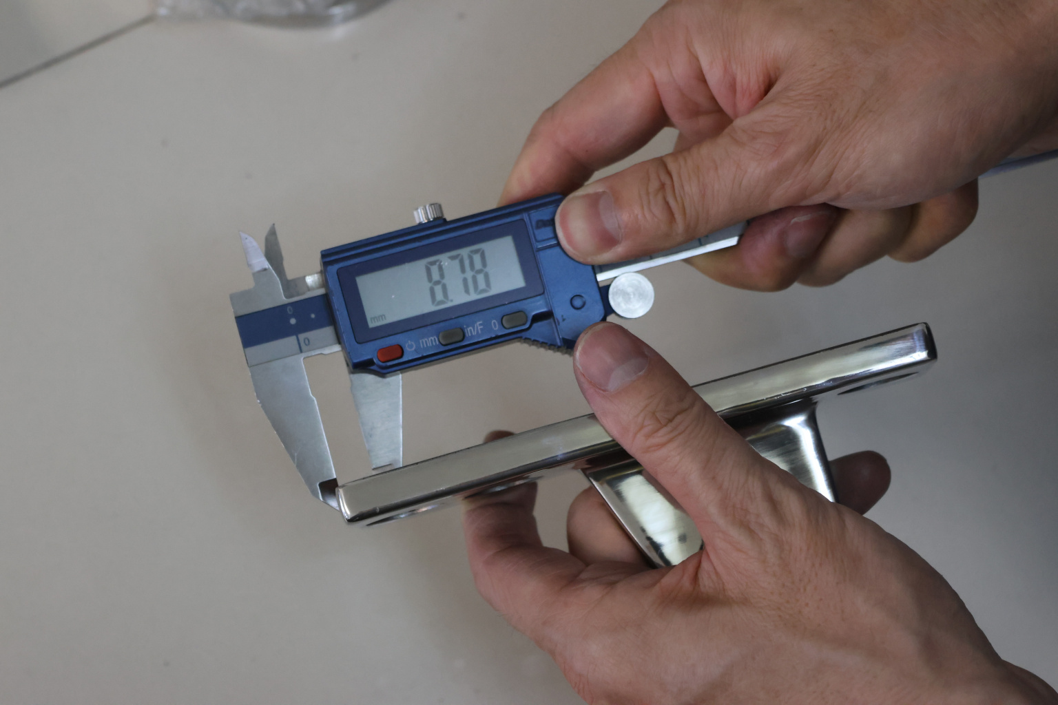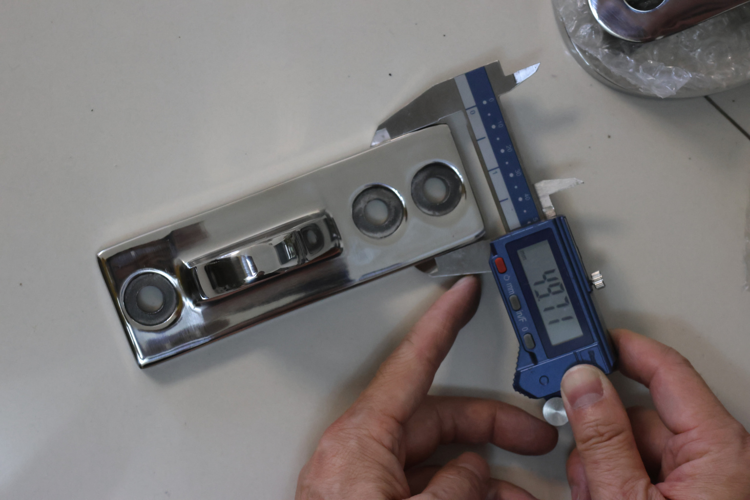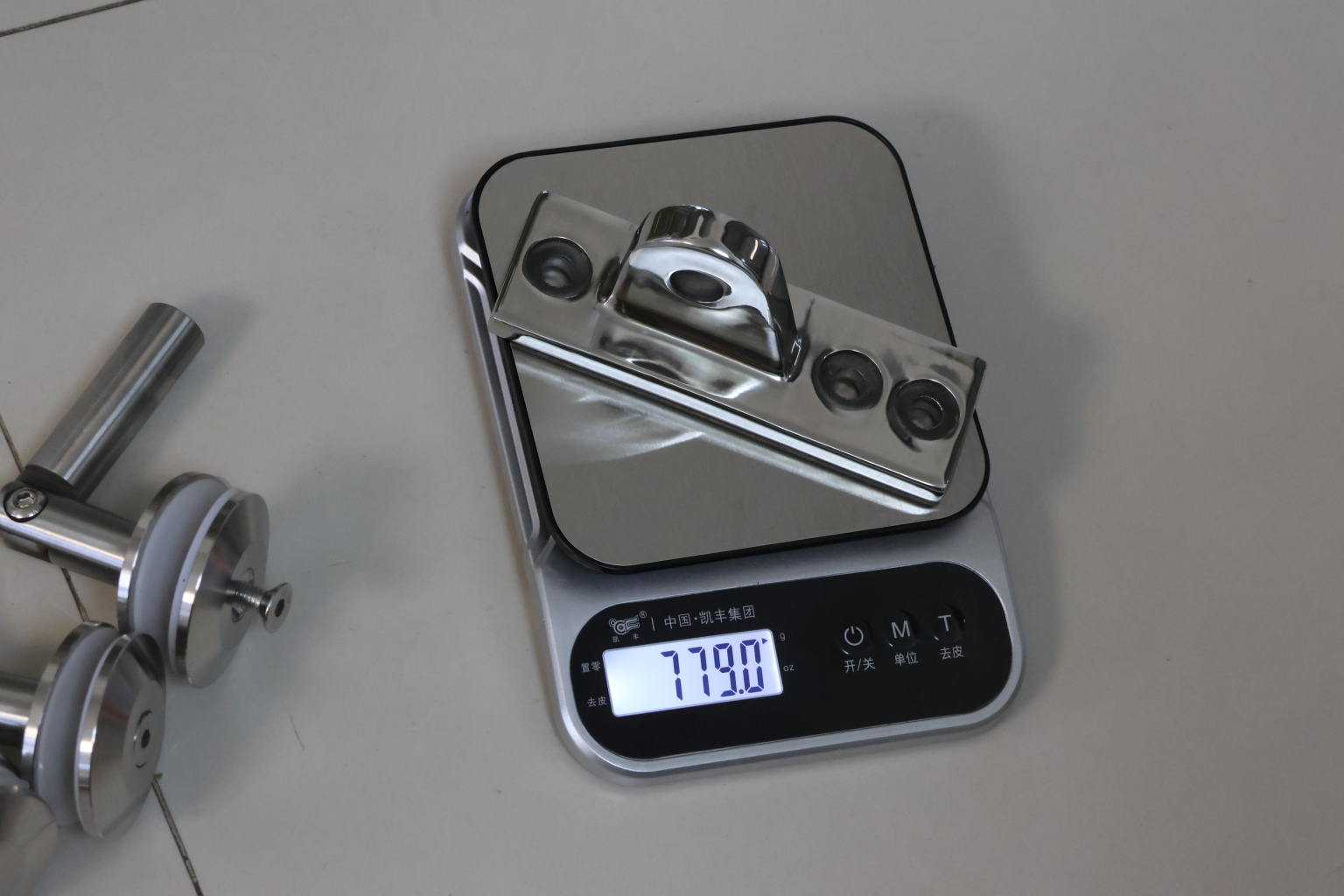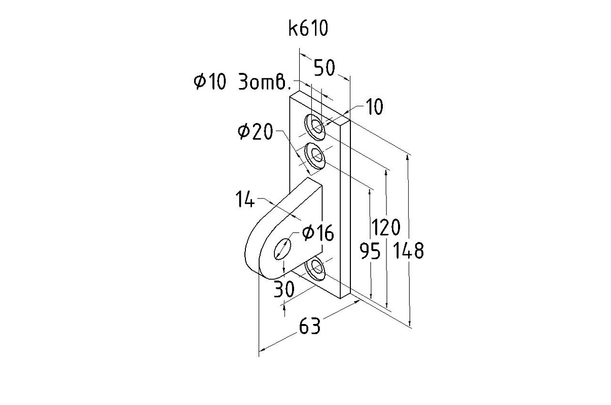 Крепление тяги к стойке. Полированная деталь. Состоит из крепёжного элемента с тремя технологическими отверстиями для крепления к стойке и выносной части с отверстием диаметром 16 мм для крепежа наконечника тяги. Выполнена из стали AISI 304. Ширина детали – 50 мм. Выносная часть выступает на 63 мм от стены.