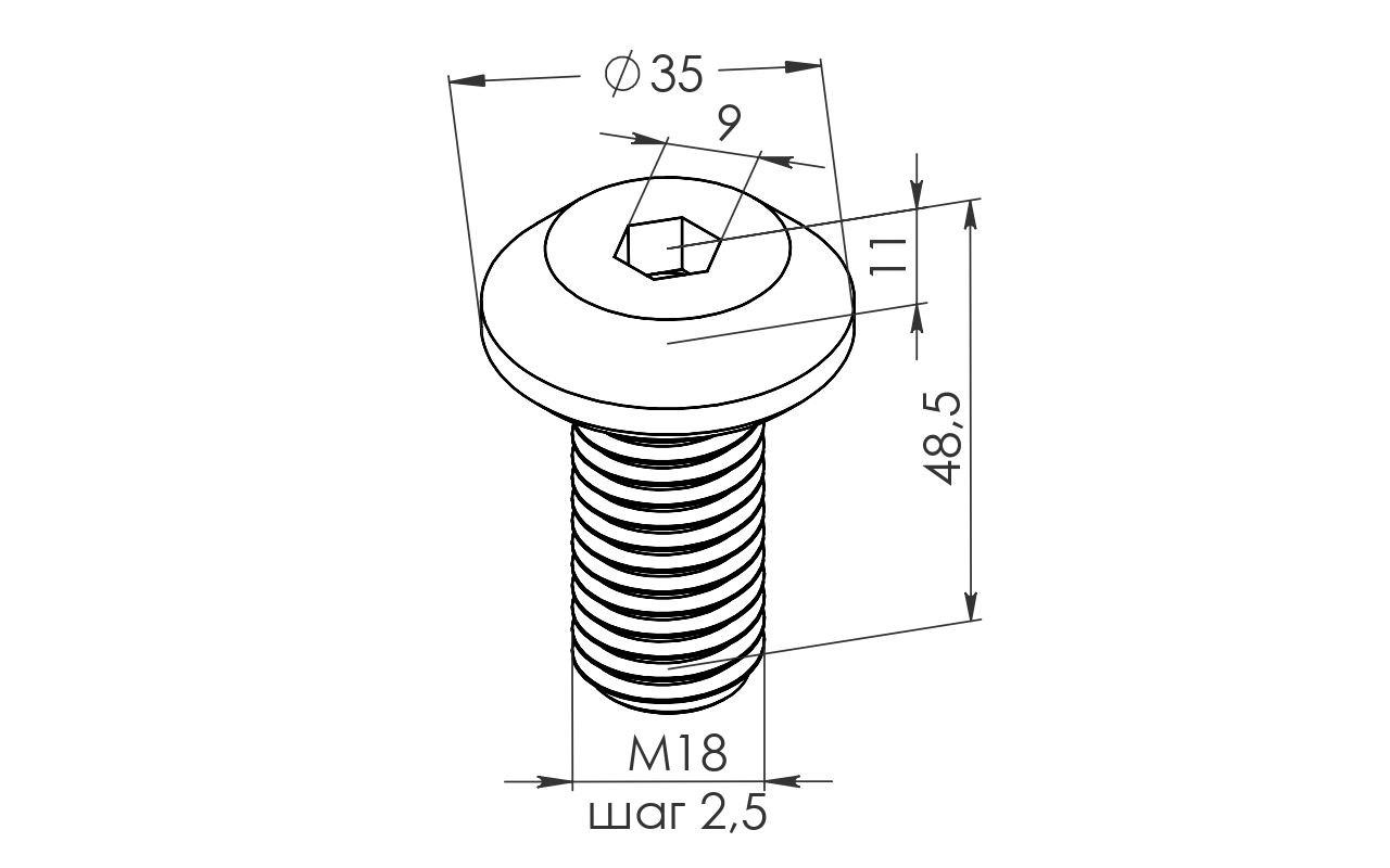 Крепежный винт с резьбой М18 для крепления спайдера, длина 50 мм, шаг резьбы 2,5 мм (AISI316) k652-2