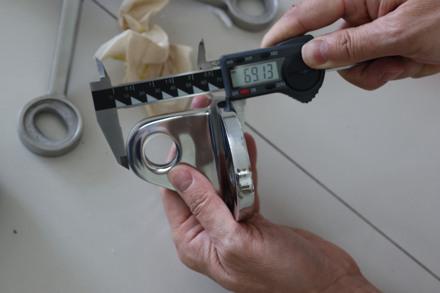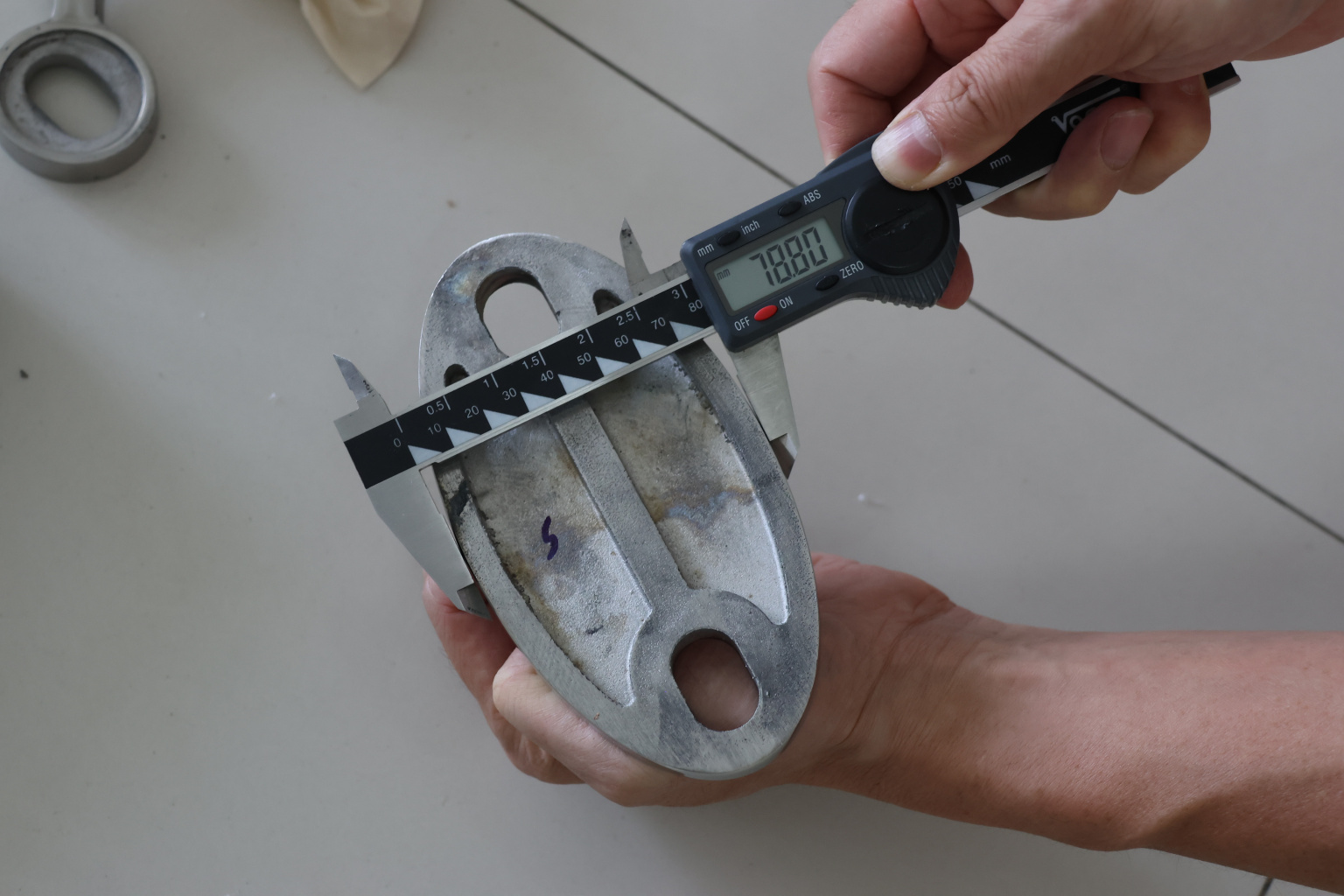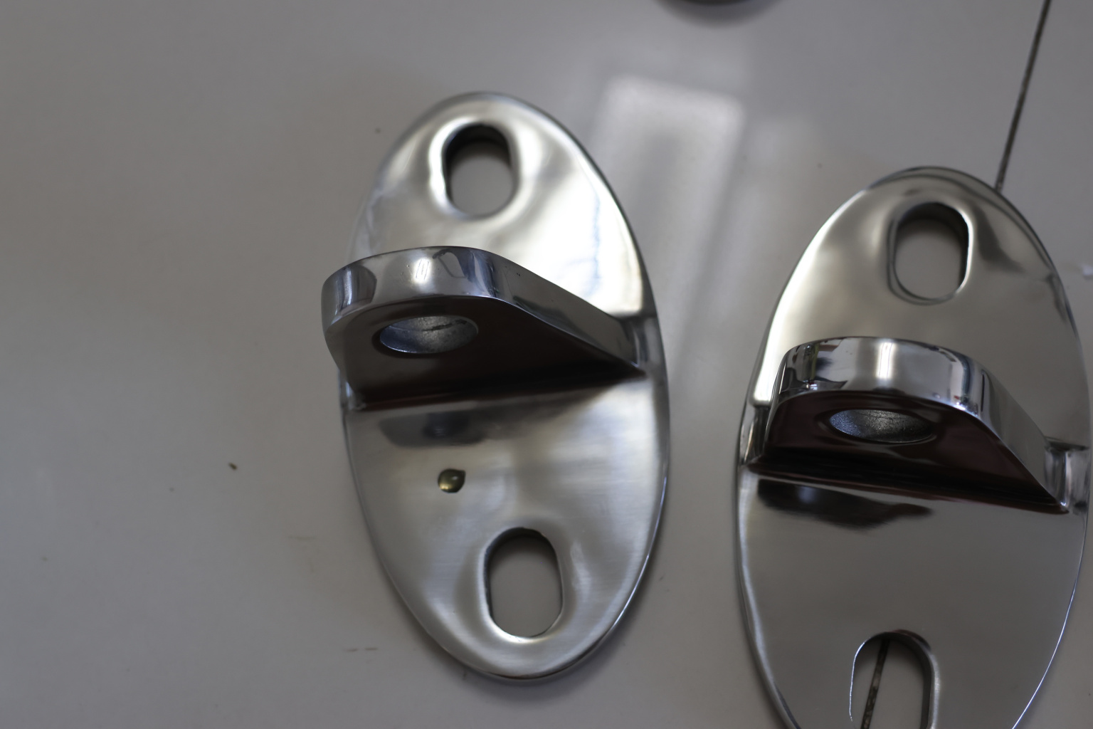 Крепление тяги к стене. Литая, полированная деталь. Состоит из крепёжного элемента с двумя овальными технологическими отверстиями 16,3 на 25 мм для крепления к стене и выносной части с отверстием диаметром 20 мм для крепежа наконечника тяги. Выполнена из стали AISI 304. Ширина детали – 150 мм, расстояние между центрами крепёжных отверстий – 105 мм. Выносная часть выступает на 48 мм от стены.