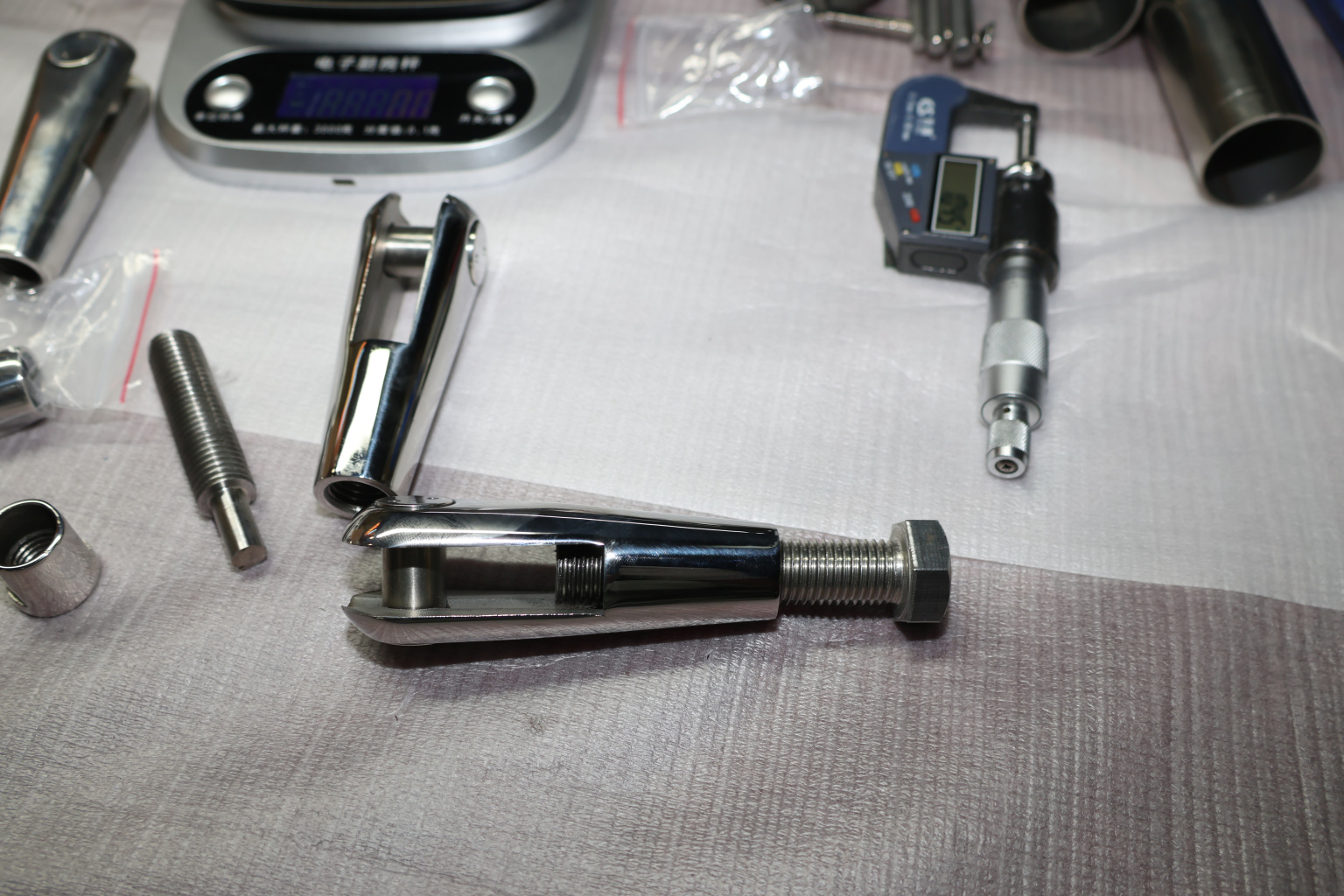для крепления к серьге. Деталь выполнена из стали AISI 304. Длинна наконечника 138 мм от начала ванты до середины фиксатора. Ширина 34 мм. Длинна паза в месте расположения фиксатора 50 мм, а ширина 15 мм. Выдерживает