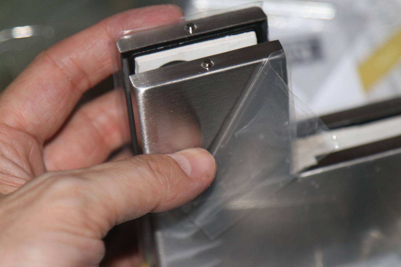 сбоку нажимаем на крепления крышек и снимаем. Отвинчиваем винты, и фиксируем фитинг в подготовленный вырез в стекле. Далее закручиваем и фиксируем обратно крышки.