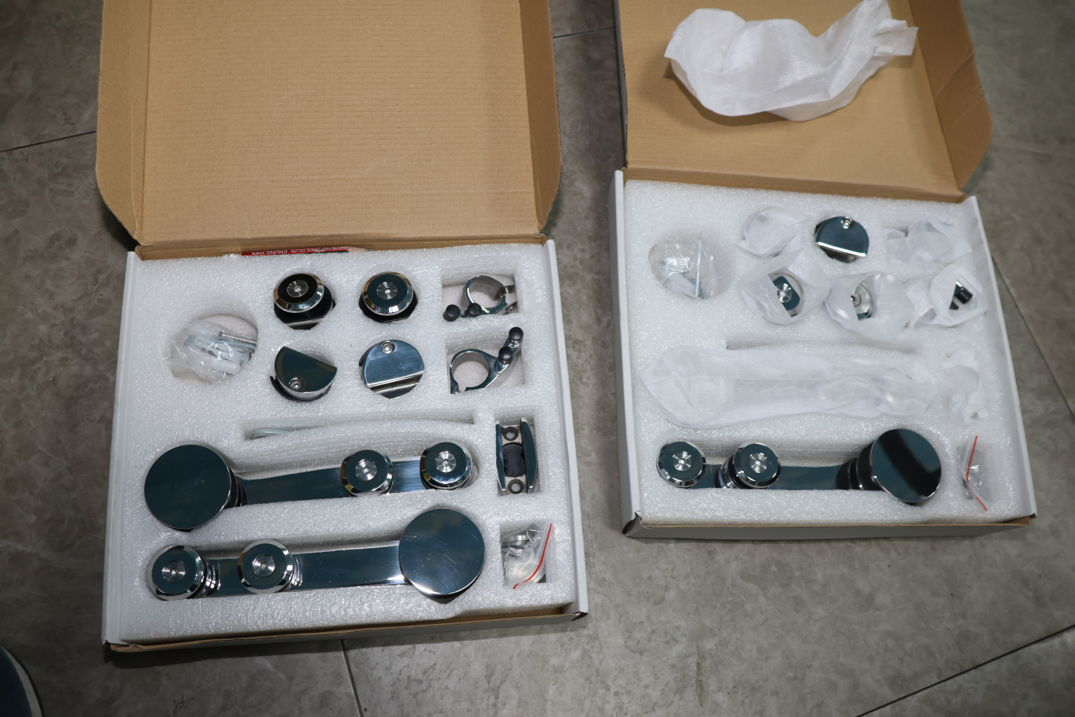 Толщина стекла лежит в диапазоне 10 -12 мм. В один комплект входит: каретка (2 шт.), крепление трека к стеклу (4 шт.), напольная направляющая двери (1 шт.), стопор для каретки (2 шт.), заглушка трека (2 шт.). На расчет расстояния между креплениями трека оказывают влияние: вес двери, ширина прохода, ширина стенового портала, высота неподвижного стекла, а также высота общая (от нижнего края фрамуги до пола).