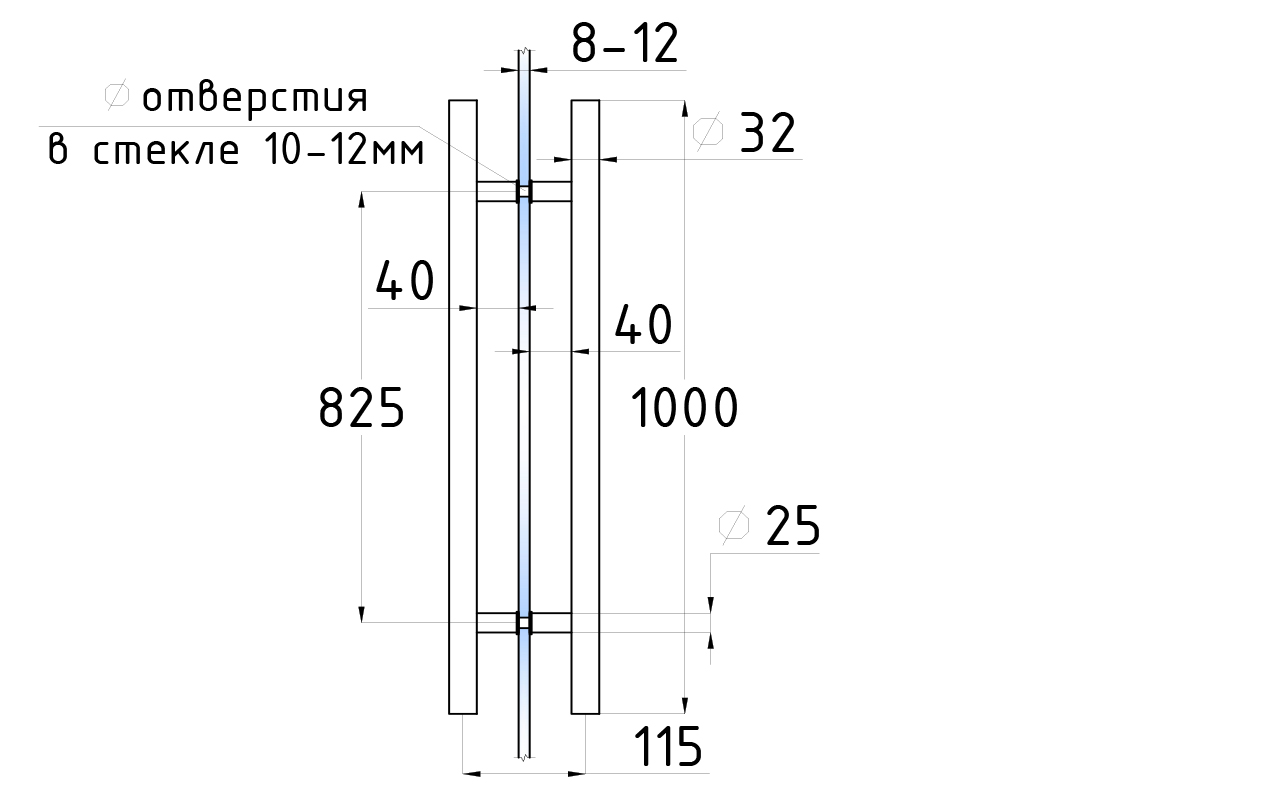 Ручка для стеклянной двери рейлинг двухсторонняя для стекла 8-12 мм, 32х825х1000 мм, полированная, марка стали- AISI 304
