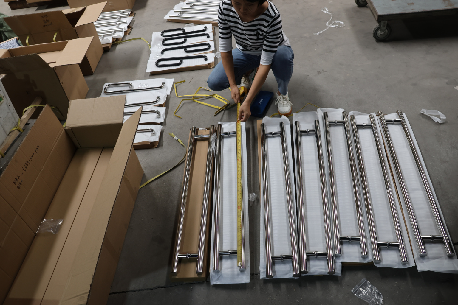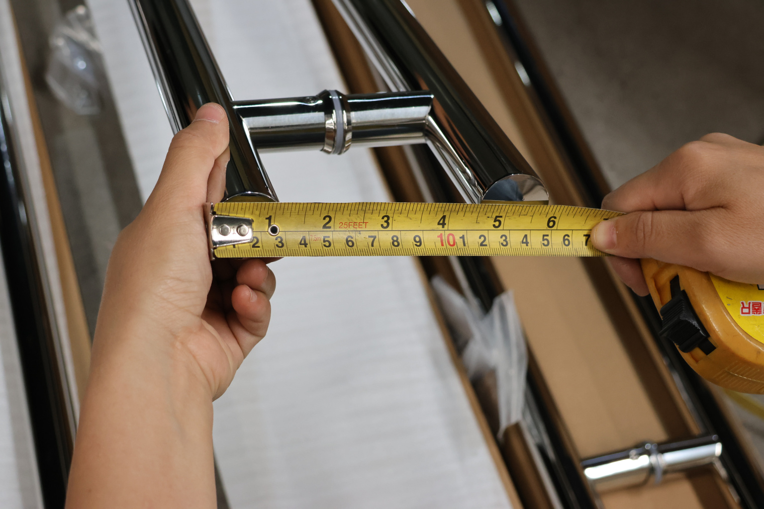 у основания ручки откручиваем с помощью шестигранника винты, делим ручку на две части, в заранее заготовленные отверстия вырезы в стекле 10-12 мм фиксируем первую часть ручки в отверстиях и с обратной стороны ответную часть затягиваем с помощью шестигранника