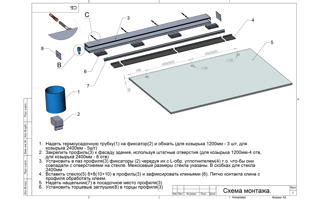 Предназначен для установки козырьков с выносом стекла до 950мм. Козырек на алюминиевом профиле станет отличным решением для загородного дома , поскольку профиль может держать стекло с выносом до 950мм вынос без использования вант. Простота в установке делает его отличным выбором для не профессионалов , поскольку единственный элемент который нужно закрепить над крыльцом - это профиль, который несет на себе всю нагрузку. Вставки в отверстия в стекле позволят ставить козырек под любым наклоном, даже 90 градусов, что позволит использовать данную конструкцию в качестве защитного экрана или элемента декора.