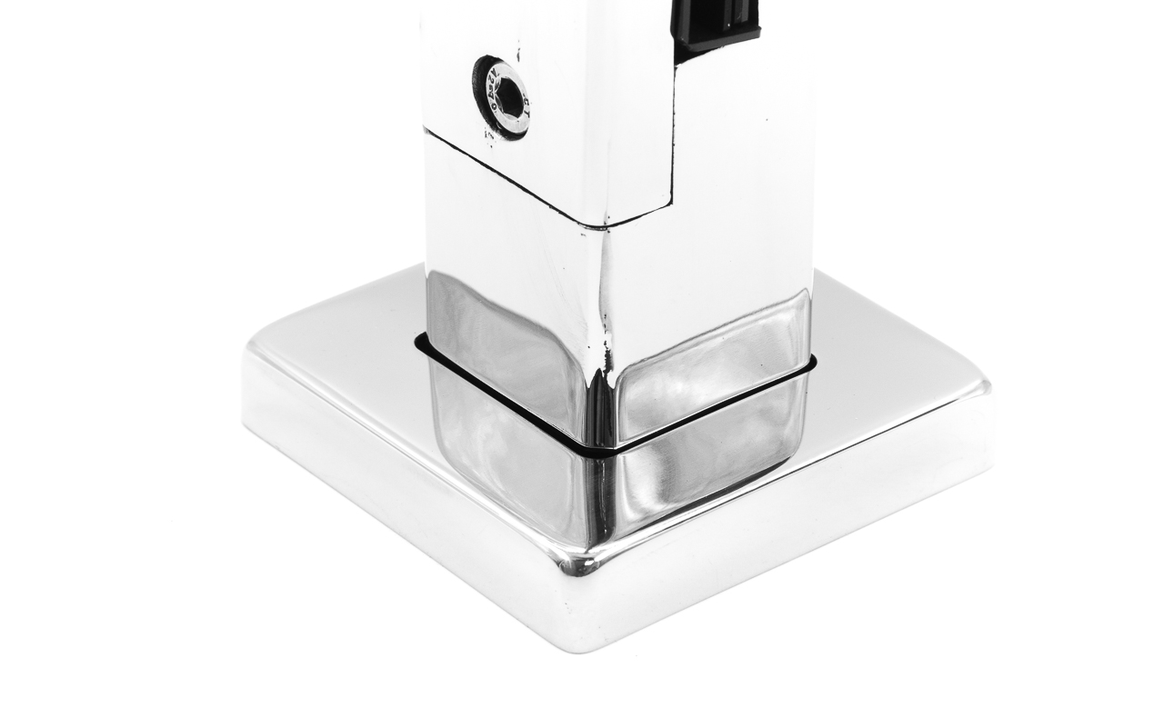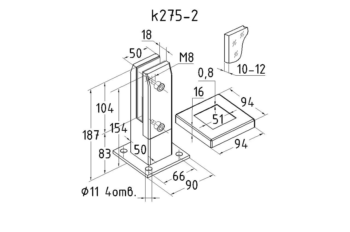 Стеклодержатель литой напольный, плоский 50х50х190 мм, для стекла 10-12 мм, полированный. Марка стали - AISI 304. Вам понадобиться для крепежа потайной винт под шестигранник k601-19-120Необходимо отверстие в стекле- 16 мм.
