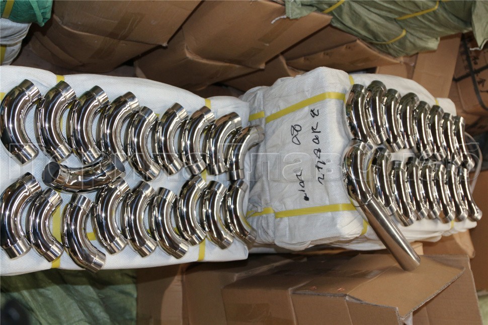 k383-3 отвод поручня под Ø42.4х1.5 мм, 90°, литой, полированный 600 Grit, с двумя установочными кольцами (AISI 201)