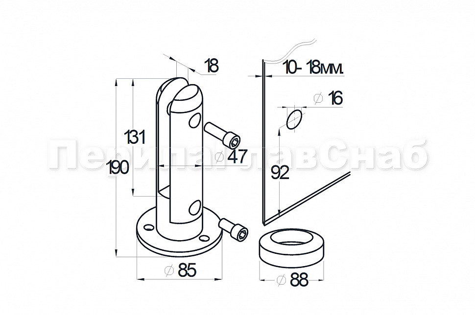 Напольный нержавеющий стеклодержатель предназначен для монтажа ограждений со стеклом от 12 до 18 мм. Изготовлен из 304 марки стали, что позволяет монтировать его не только внутри помещения, но и на улице и у бассейнов. В зависимости от того какое стекло нужно зажать, варьируется количество уплотнителей, каждый из которых имеет толщину 0.4 мм.