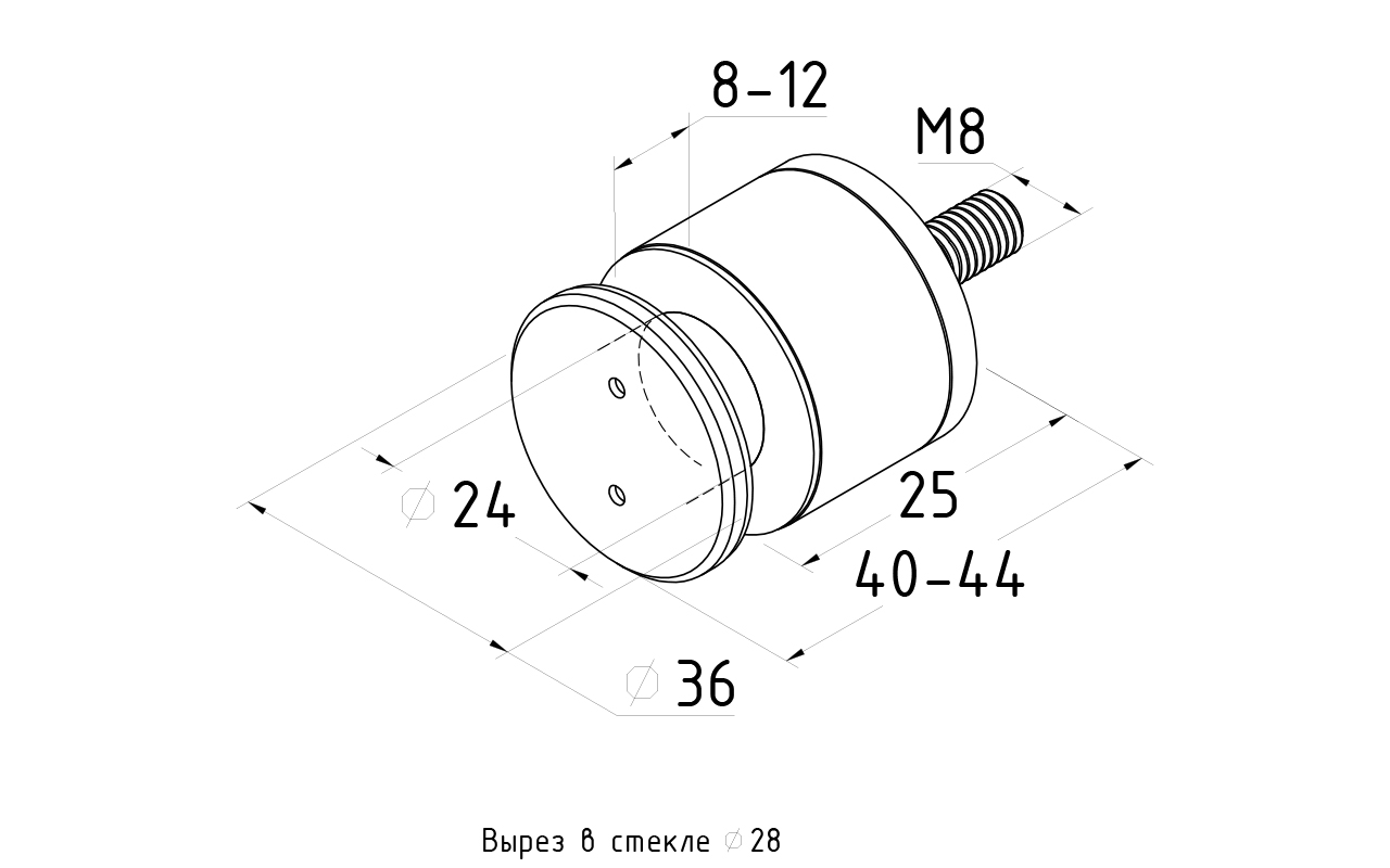 Точечный стеклодержатель Ø36x40, для стеклянных стен, регулируемый, под стекло 8-12 мм, марка стали- AISI304, поверхность- шлифованная