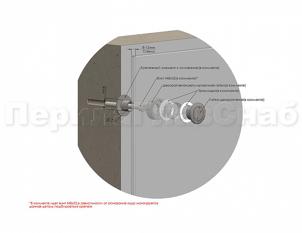 Корпус стеклодержателя приваривают или прикрепляют на саморез, либо штатный винт к стене. А в стекле делают отверстие Ø28 мм под шток стеклодержателя. Толщина стекла варьируется в диапазоне от 8 до 12 мм. Для затягивания гайки рекомендуем использовать ключ k367-2.