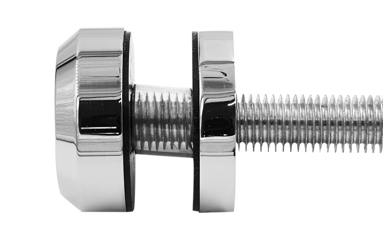 Точечный стеклодержатель для торцевого крепления несущего стекла в широчайшем диапазоне от 8 (4+4) мм до 40 (20+20) мм. Диаметр наружной (хрюшка) и внутренней шайб по 50 мм.