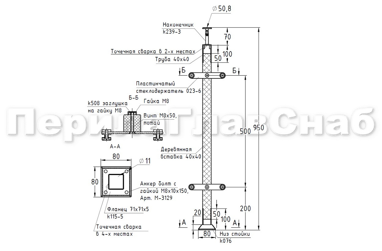 Готовая стойка 40х40х950 мм, деревянная, со вставками из нержавеющей стали 2х100 мм с 3 ригеледержателями k740-1-G купить в Симферополе
