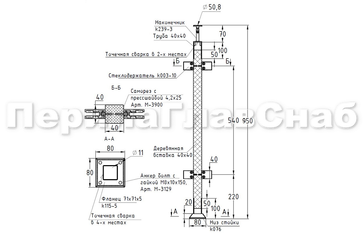 Стойка квадратная 40х40: 4 литых стеклодержателя, шлифованная, высота 950 мм AISI 304 k746-7 купить в Симферополе