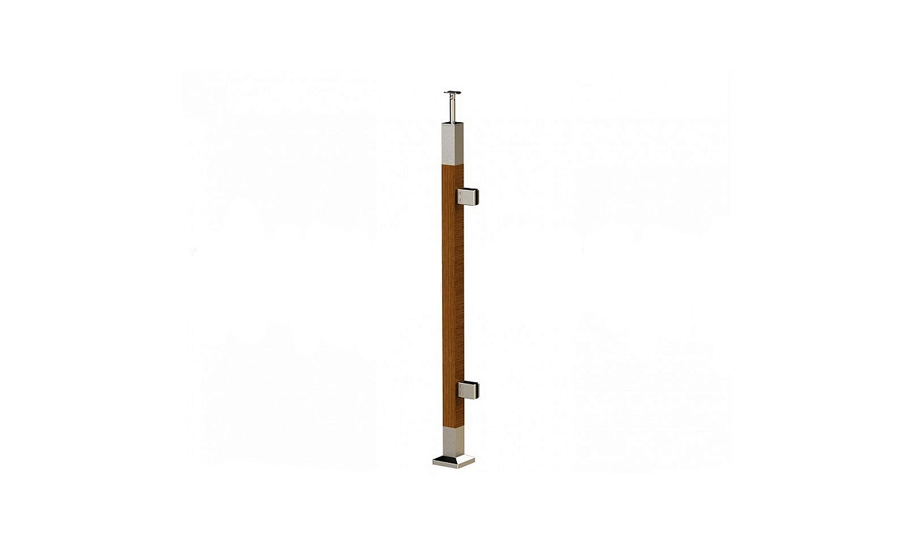 Готовая стойка 40х40х950 мм, деревянная, со вставками из нержавеющей стали 2х100 мм, с 2 зажимными стеклодержателями, правая