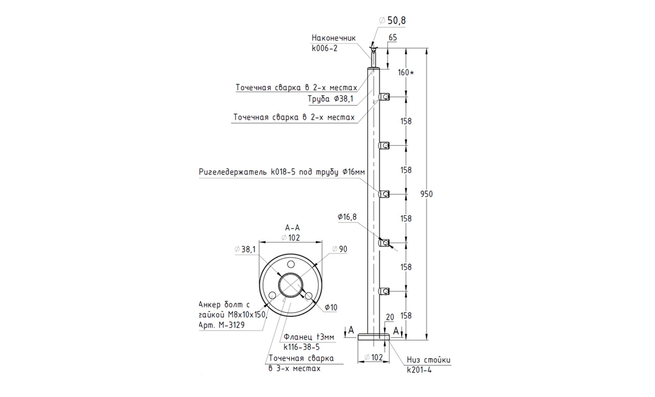 Готовые стойки – это экономия вашего времени и денег. Приобретая готовую стойку Вы можете собрать ограждение сами, не привлекая монтажную бригаду и экономя денежные средства на монтаже. Стойка легко монтируется к полу благодаря треханкернуму фланцу с отверстиями под анкер-болт М8 ( М-3129, М-3843, М-3838), а крепеж скрывает декоративная крышка идущая в комплекте стойки. Ригеля фиксируются при помощи шестигранника ( k931, k932). Поручень из нержавеющей стали так же легко закрепить при помощи сверла по нержавеющей стали ( k961-03, k961-03.5, k961р-03.5, k961р-03) и самореза ( М-3850, М-3847, М-3215). Либо при помощи заклепки ( М-3214) и винта М6 ( М-3973), для крепления при помощи заклепок необходимо растачивать отверстие в ложементе. Если вы используете пластиковый ( k893, k897, k892, k891, k894, k895, k899) или деревянный поручень, то его можно закрепить при помощи саморезов ( М-3217)