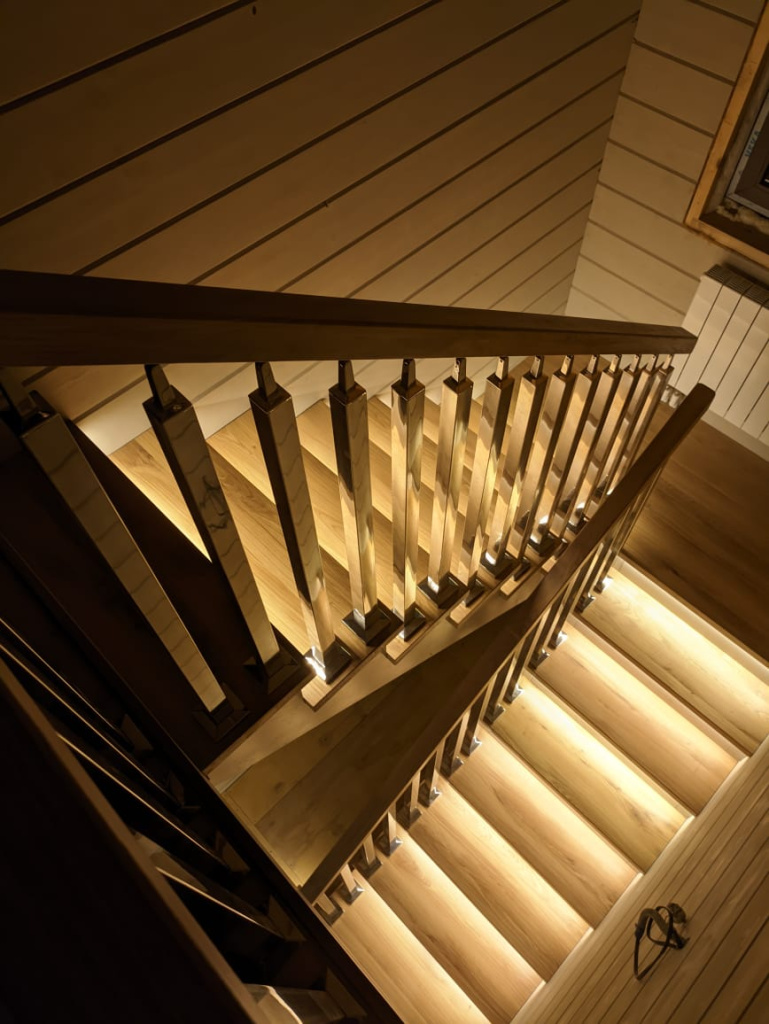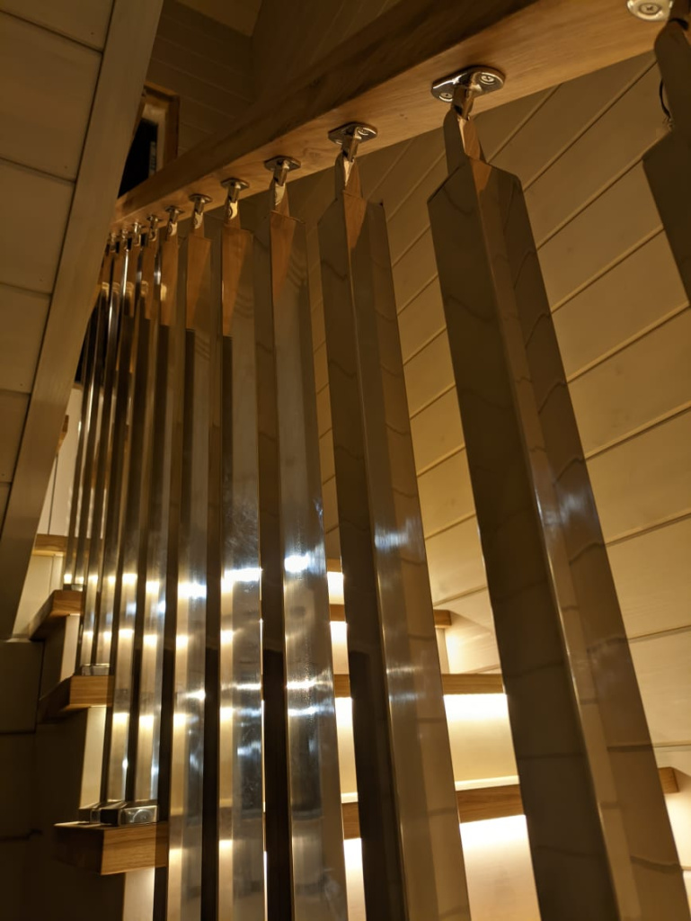 Это позволяет достичь уникального стиля, где прочность и современный дизайн перил сочетаются с естественной красотой дерева.