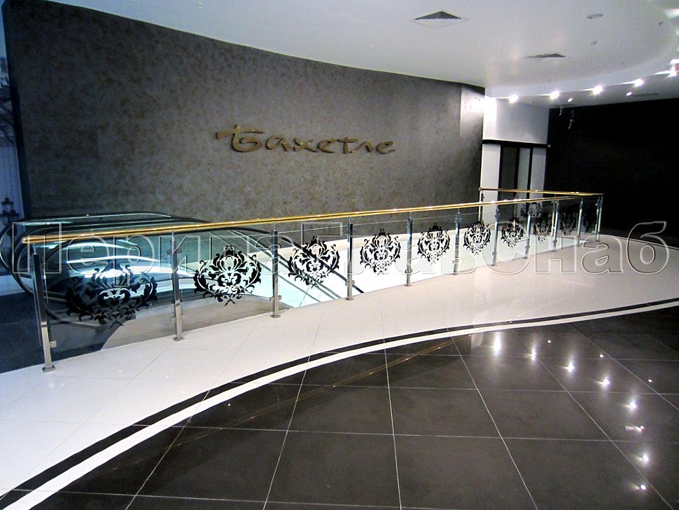 Ограждение атриума из нержавеющей стали и стекла с нанесенным фирменным логотипом компании, встретило посетителей магазина всем блеском и великолепием сочетания золота и стекла, создавая незабываемую атмосферу роскоши и комфорта.