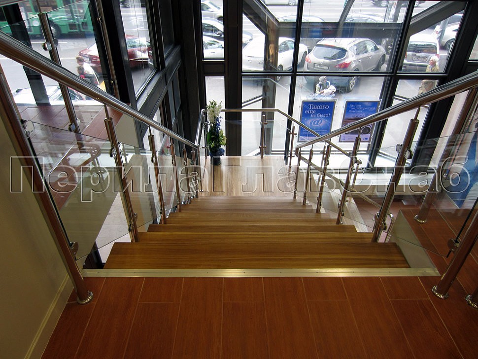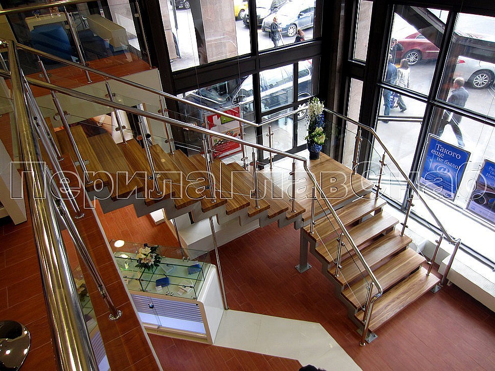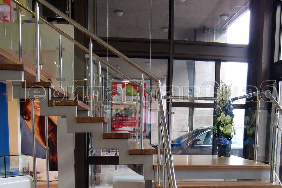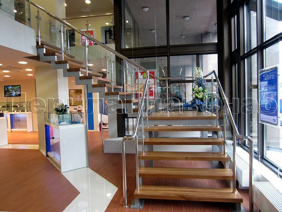 В салоне связи МТС на Новом Арбате была установлена элегантная лестница с деревянными степенями и ограждением из нержавеющей стали и стекла.