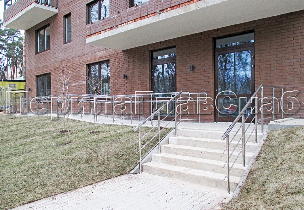 Наша компания проводила работы по установке нержавеющих ограждений для входных групп и пандусов в элитном поселке Горки 10.