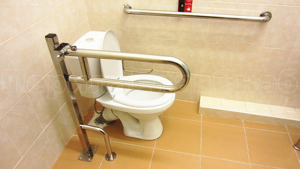 - Также были установлены поручни в ванную комнату и туалет для маломобильных групп населения: труба диаметром 38 мм, установлена на боковых крепежах к стене, на стойке с выходом в пол у раковины, и на квадратной стойке возле туалета.
