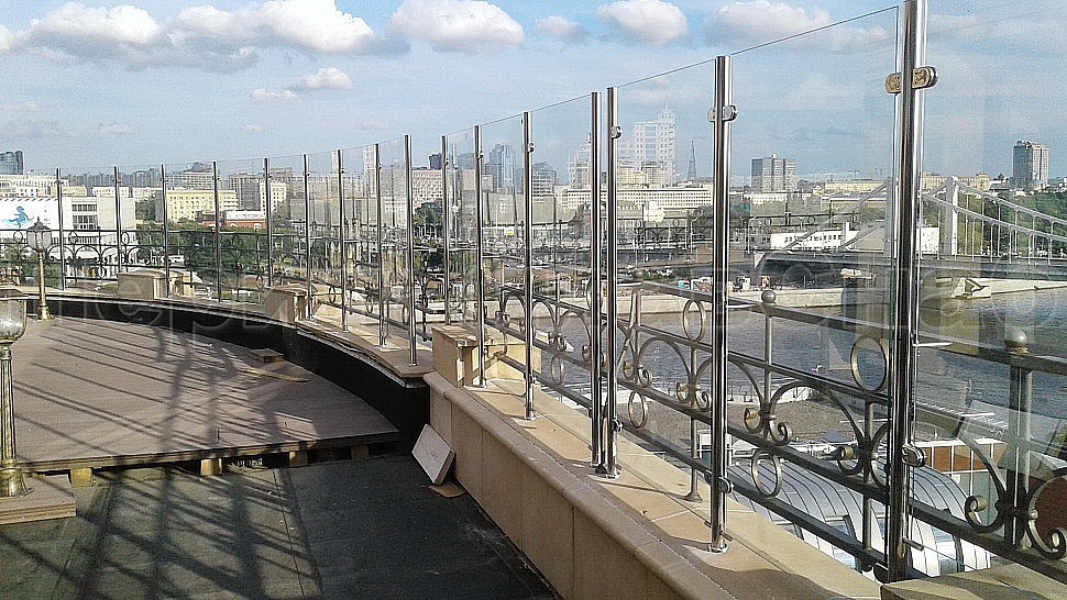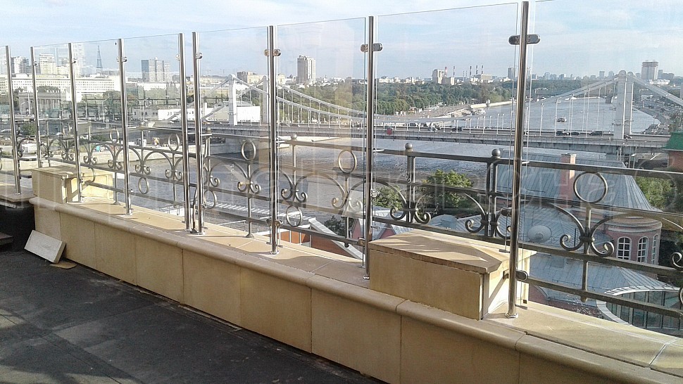 Заказ выполнялся на установку ограждений из полированной нержавеющей стали марки AISI 304, высотой 1400мм от уровня парапета с креплением к существующему ограждению со стеклом, стекло прозрачное, каленое толщиной 8мм. Закреплено к стойкам на зажимных стеклодержателях. Стойки диаметром 38мм устанавливаются шагом кратным 1000мм по прямой с уловителями стекла. Крепление стоек происходило методом бурения и вклеивания, сверху на стойках установлены заглушки, а снизу декоративные крышки. Крепление нержавеющих элементов ограждения между собой производилось с помощью арогнно-дуговой сварки, длина швов 2 мм, с последующей зачисткой и полировкой.