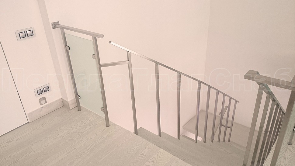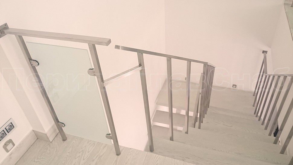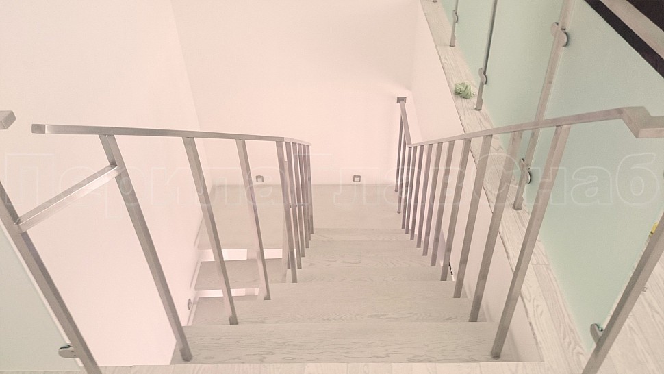 Ограждения из шлифованной нержавеющей стали. Высотой 950 мм и стойками 20х20 мм, крепление сверху через деревянную ступень заказчика и основания ступени металла 3 мм, устанавливаются в каждую ступень, на прямых участках не более 300 мм друг от друга; низ стойки декоративная крышка, поручень 40х20 мм, окончание поручня заглушка, поручень завязан. Крепление нержавеющих элементов ограждения между собой точечная аргонно-дуговая сварка, длина швов 2 мм, с последующей зачисткой и полировкой.