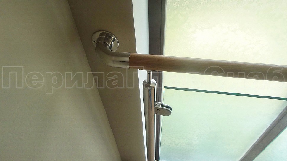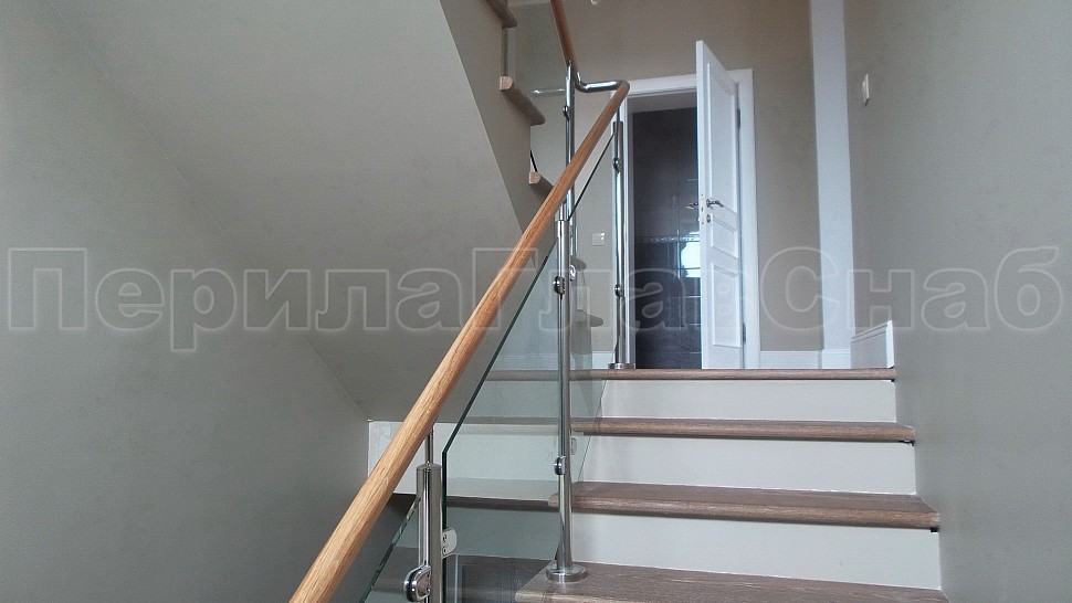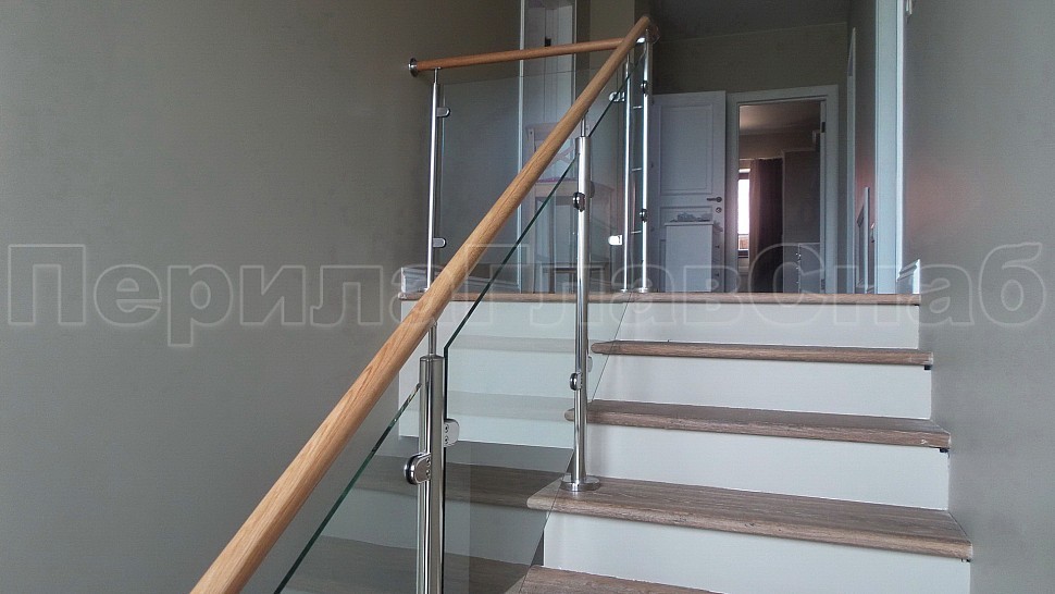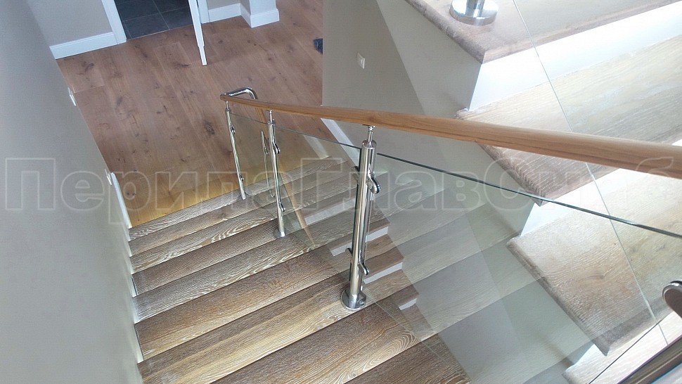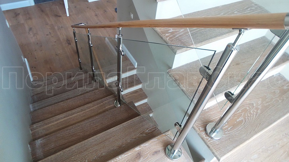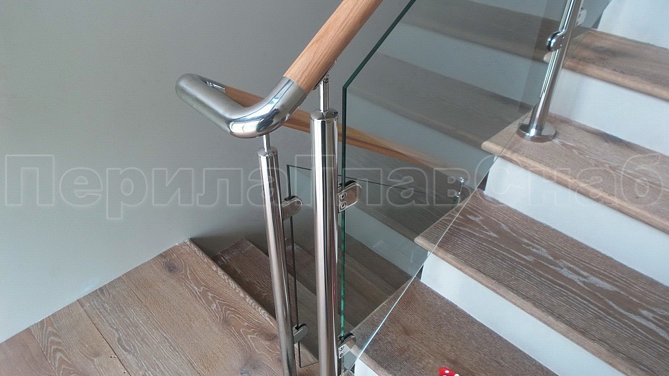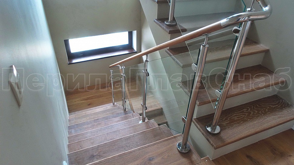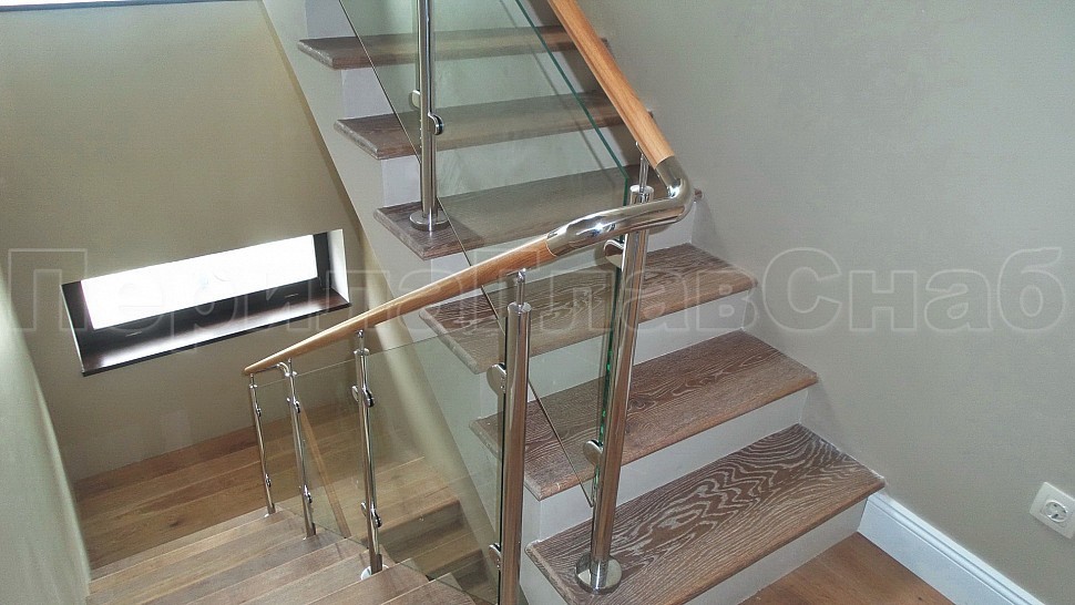 Стильное ограждение из нержавеющей стали с деревянным поручнем - оптимальное решение для частного дома. Деревянный поручень, в отличие от металлического, теплый на ощупь - за него удобно и приятно держаться. Сочетание натурального дерева и нержавеющей стали выглядит очень стильно и такое ограждение великолепно впишется в любой интерьер. В нашу компанию поступил такой заказ. Ограждения из полированной нержавеющей стали внутренние со стеклом высота 950 мм, стойки диаметром 38 мм, крепление сверху методом алмазного бурения диаметр 42 мм на глубину 70 мм, устанавливаются через две ступени в третью, на прямых участках не более 1000 мм друг от друга, наконечник стойки штырь; стекло закаленное прозрачное 8 мм, крепится на зажимные стеклодержатели; низ стойки декоративная крышка диаметр 56 мм, поручень деревянный диаметр 38 мм из дуба тонированный и лакированный, окончание поручня заглушка, уходов поручня в стену через фланец, поручень завязан нержавеющим отводом. Крепление нержавеющих элементов ограждения между собой точечная аргонно-дуговая сварка, с последующей зачисткой и полировкой.