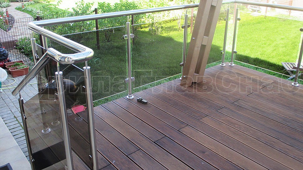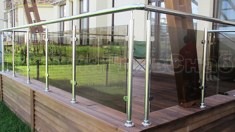Такой заказ был принят и одобрен на монтаж ограждения террасы из полированной нержавеющей стали со стеклом, высотой 950 мм. Стойка труба диаметром 38 мм, низ стойки цанга, верх стойки штырь, с закаленным стеклом цвет "бронза" 8 мм и с полировкой кромок по периметру, с литыми стеклодержателями и порученем из полированной нержавеющей стали диаметром 50 мм. Стойки устнавливаются в горизонте с шагом кратно 900-1200 мм на фланце в деревянный настил на саморезах. Поручень завязан отводами диаметром 50 мм. Крепление нержавеющих элементов ограждения между собой точечная аргонно-дуговая сварка, длина швов 2 мм, с последующей зачисткой и полировкой.