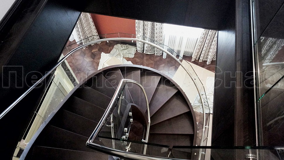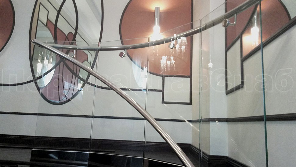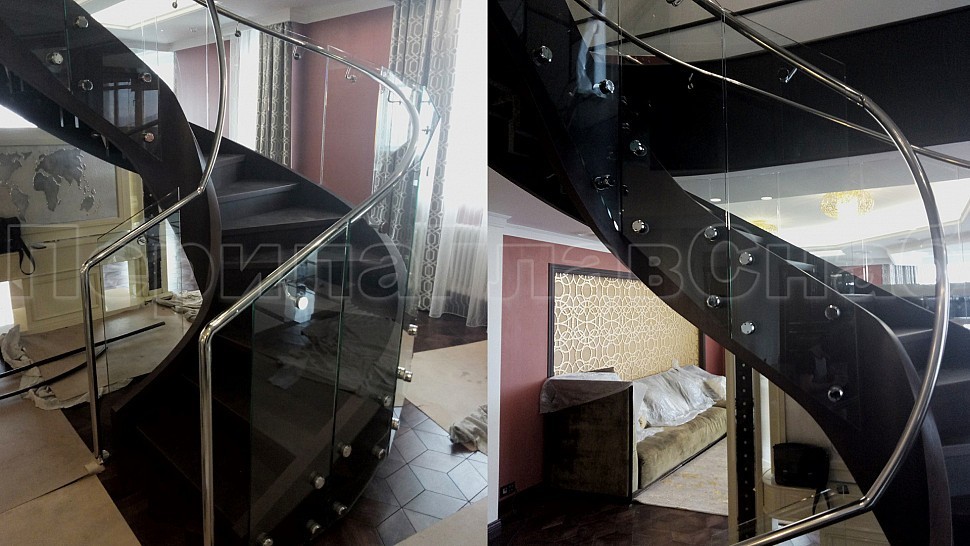 В загородный дом были установлены стильные ограждения из каленого прозрачного стекла 10 мм для винтовой лестницы. Стекло крепится с торца при помощи точечного держателя из полированной нержавеющей стали. Верхние точечные держатели вклеены в деревянную тетиву, нижние - крепятся через деревянную тетиву насквозь. В начале лестницы поручень уходит в пол. Крепление методом бурения и вклеивания. Низ – декоративная крышка из полированной нержавеющей стали.