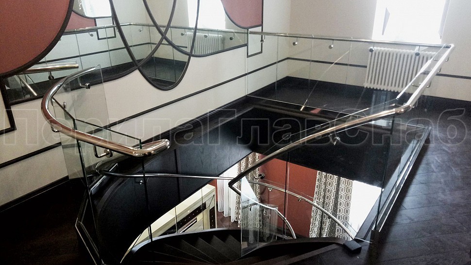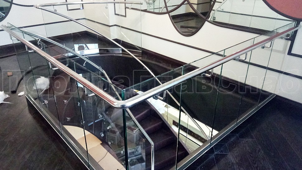 Ограждение площадки из прямого прозрачного каленого стекла. Стекло крепится на алюминиевый зажимной профиль с креплением в пол, облицованный накладками из полированной нержавеющей стали.И с поручнем диаметром 38 мм, который крепится к стеклу через выносной элемент.
