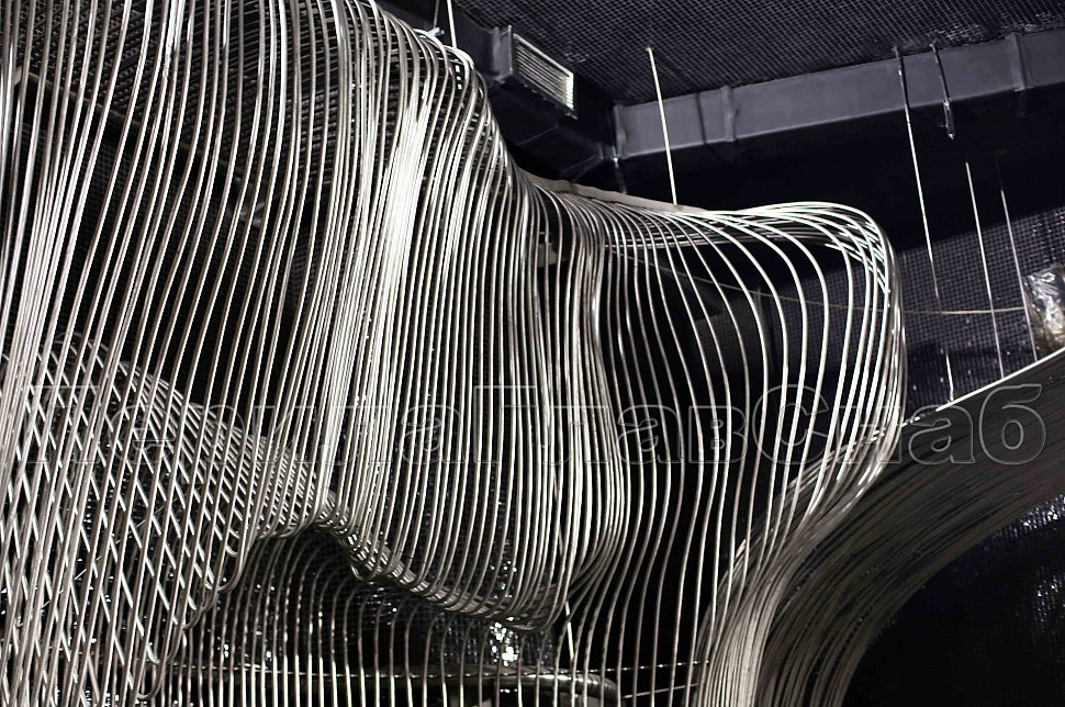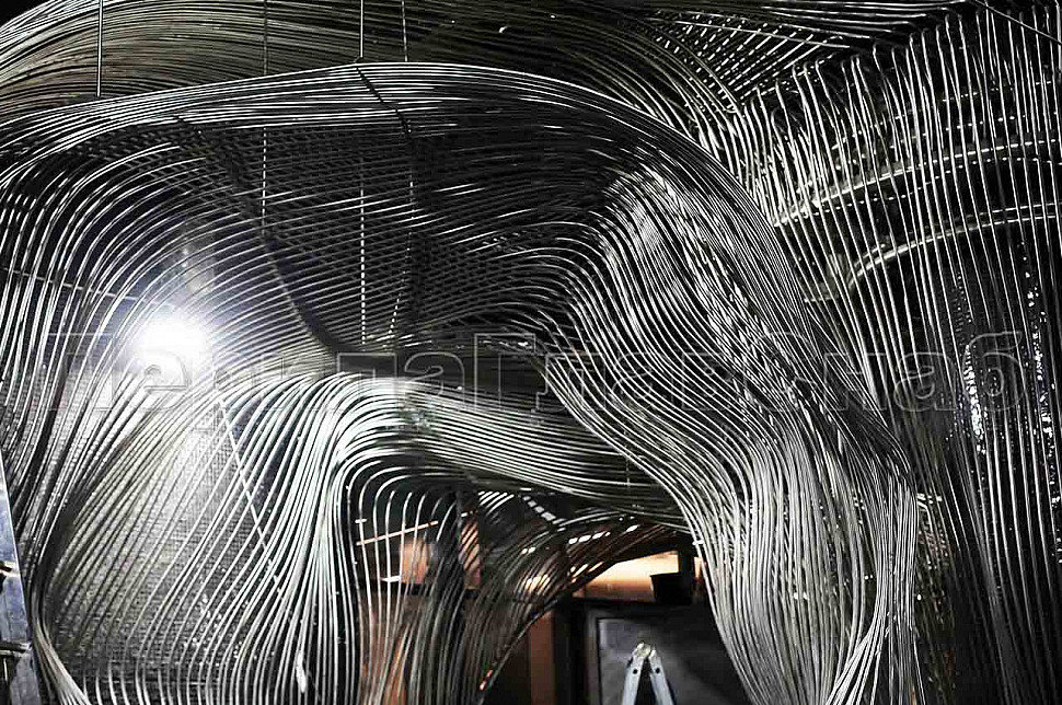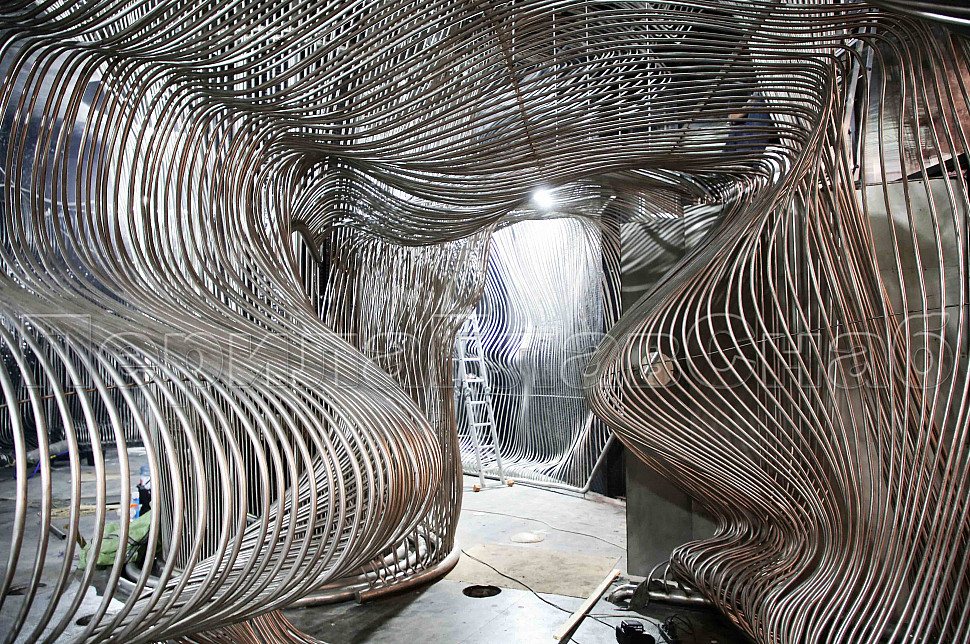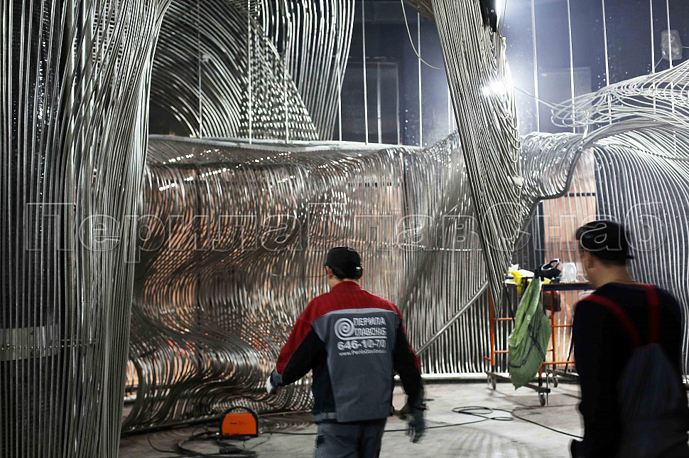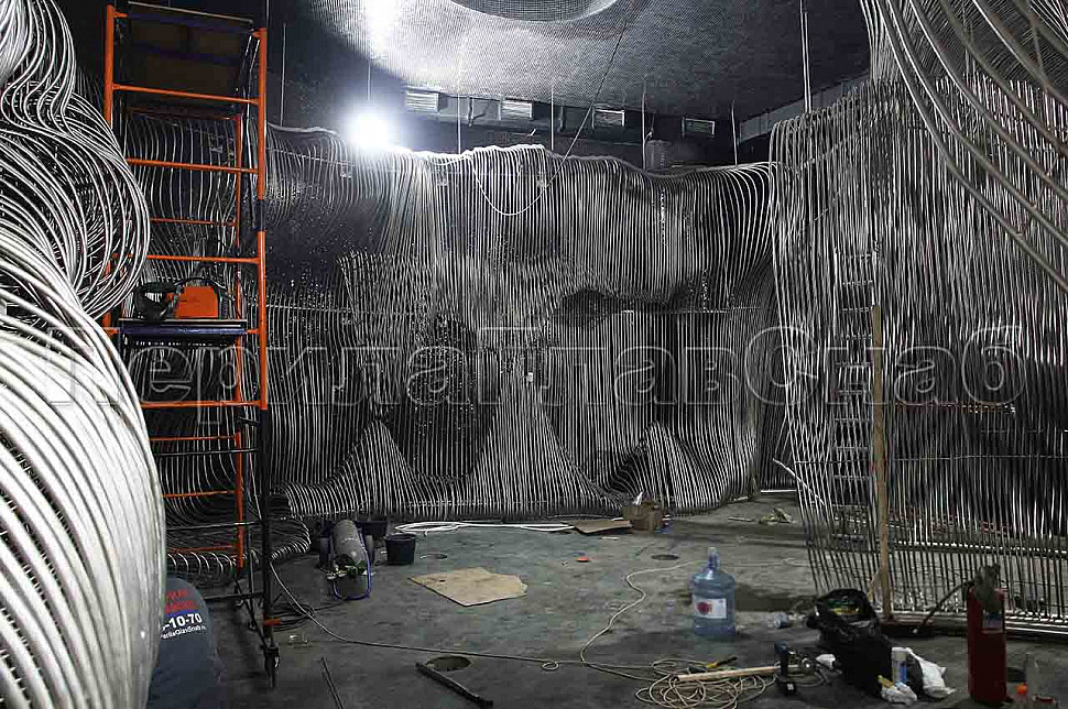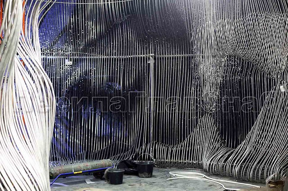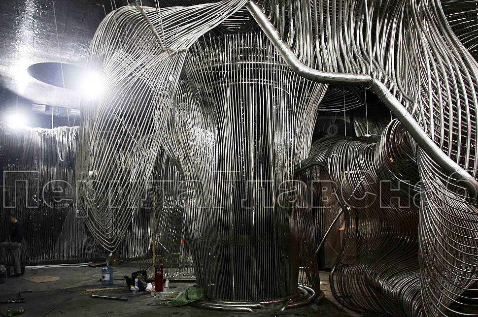 Шесть месяцев, более 150 человек, в 3 смены трудились над этим проектом. При кажущейся простоте, это очень сложная конструкция, тысяча квадратных метров 3-х мерной поверхности из нержавеющих труб 16 мм и 120 тонн льда. Каждая трубка по изгибу не похожа на предыдущие.Было много опасений за структуру льда, но удалось сделать его таким, как в Арктике.