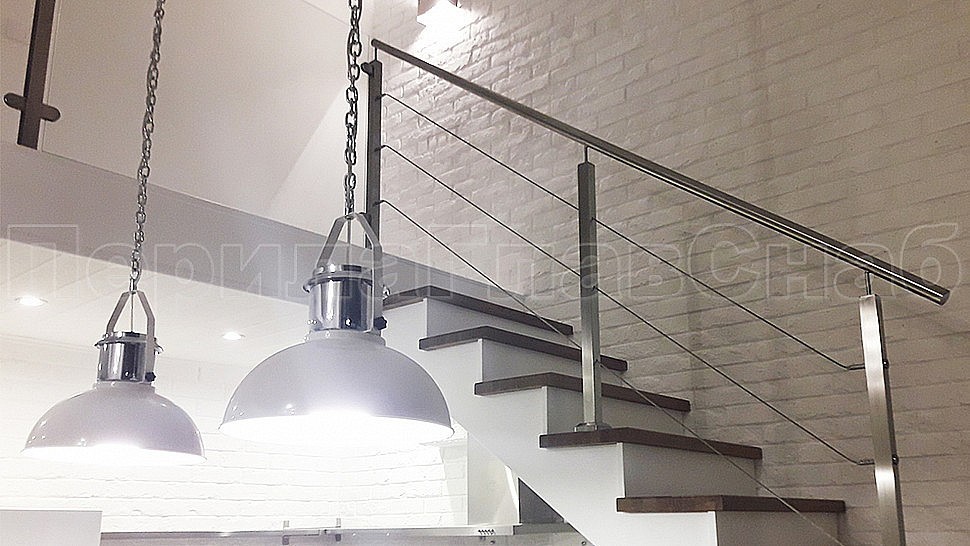 Ограждение лестницы по маршу выполнена из полированной нержавеющей стали марки Aisi 201. Высота поручня 950 мм, стойки 40х40 мм крепление сверху методом алмазного бурения устанавливаются на прямых участках 1000-1200 мм друг от друга, трос проходит сквозь стойку крепится к стойке через специальные талрепы находящиеся на крайних стойках, устанавливается равномерно по высоте стойки; поручень крепится к стоике через наконечник штырь, в начале и конце поручня заглушка.