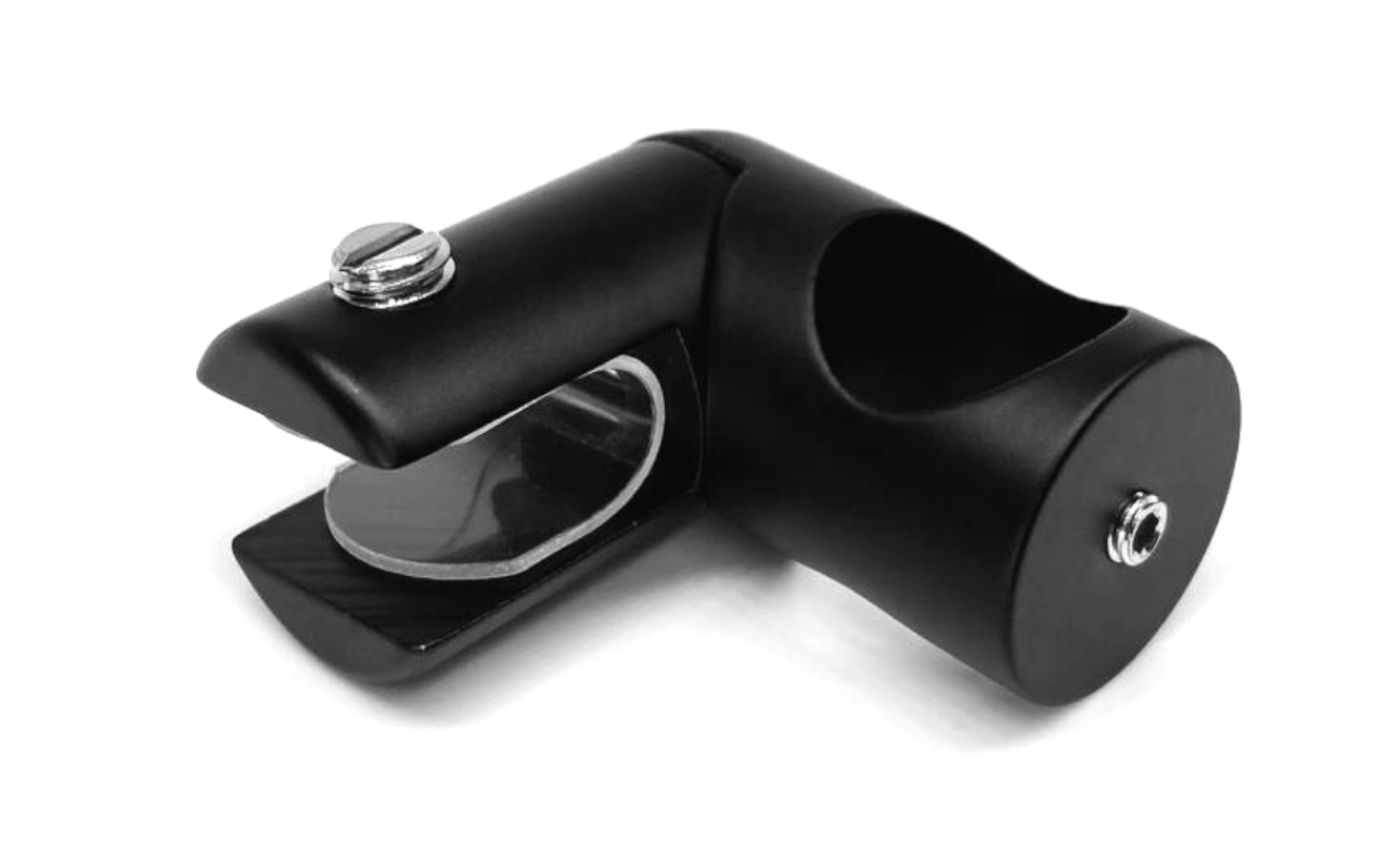Коннектор предназначен для крепления круглой трубы 19 мм к стеклу в горизонтальной ориентации параллельно стеклу, при монтаже штанг верхней обвязки душевых кабин.