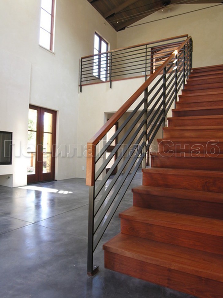 Три ригеля на сварке, квадратный деревянный поручень и круглые стойки