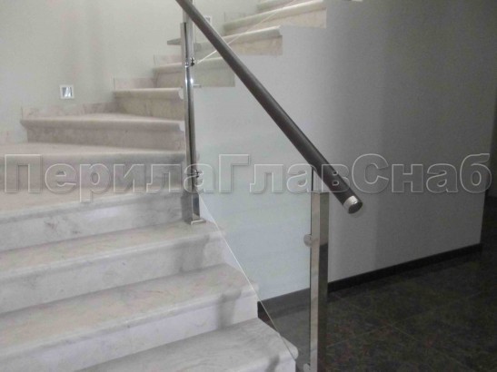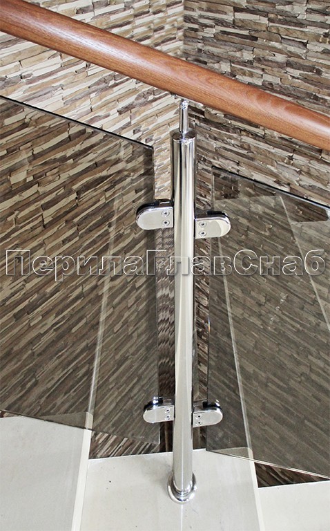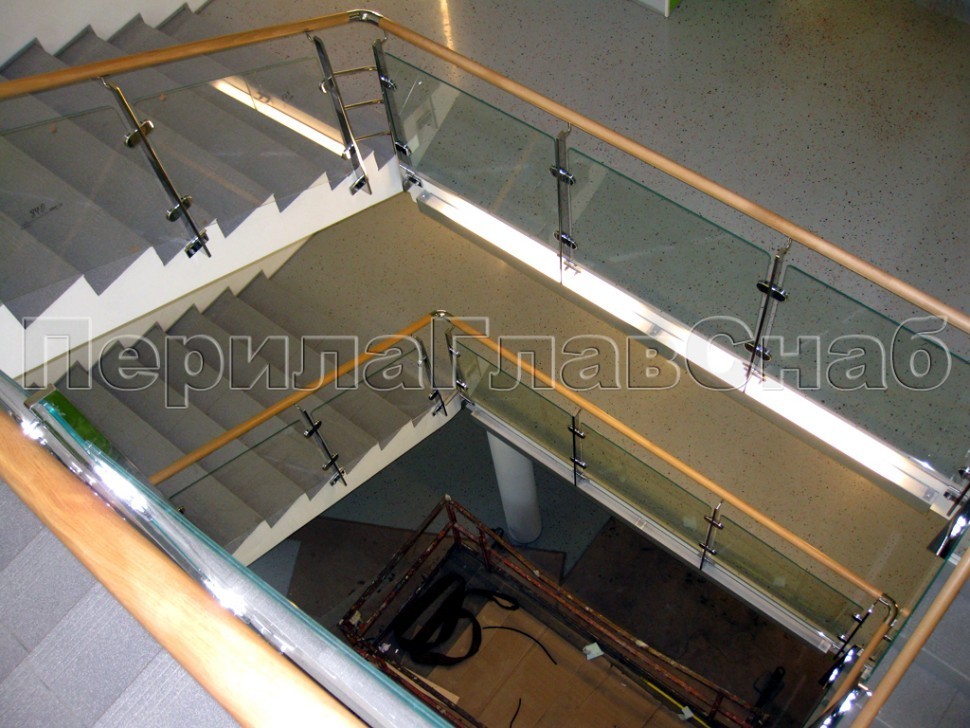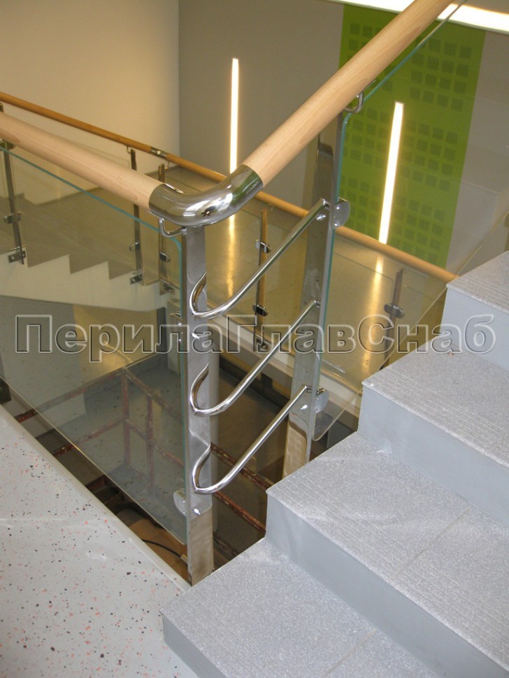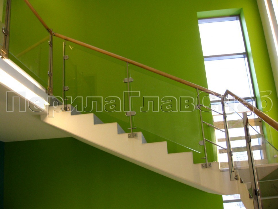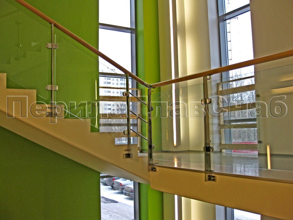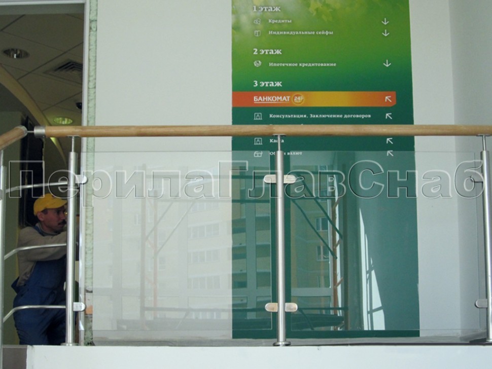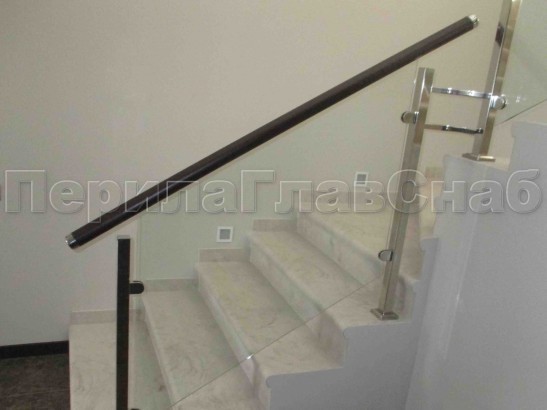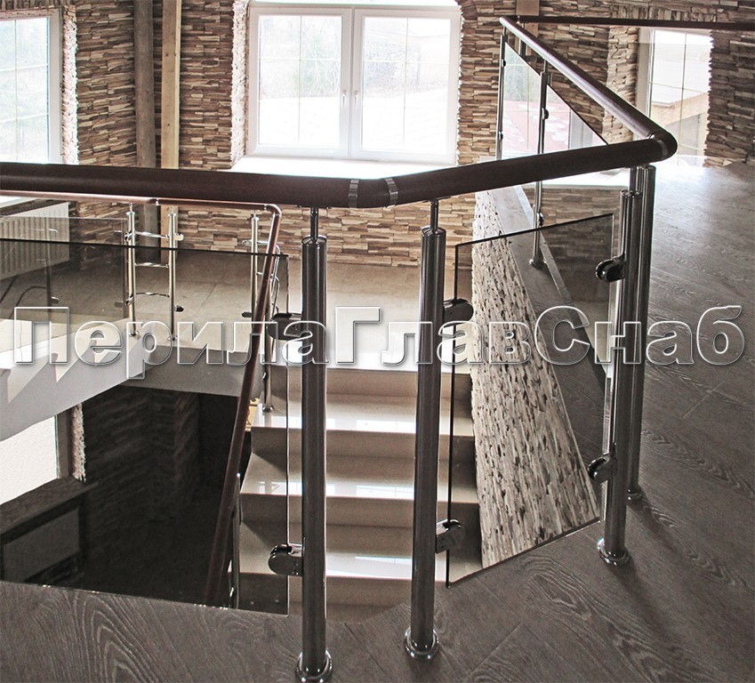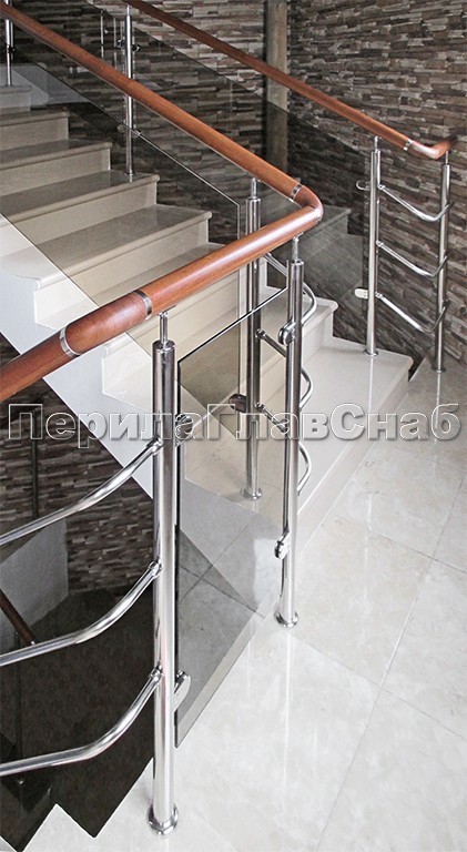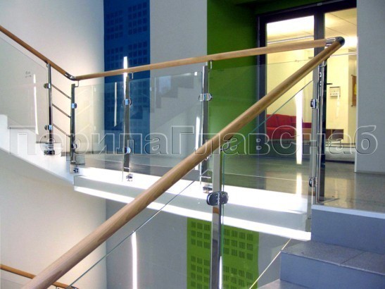 Записаться на встречу Ограждение с деревянным поручнем, стеклом и стойками