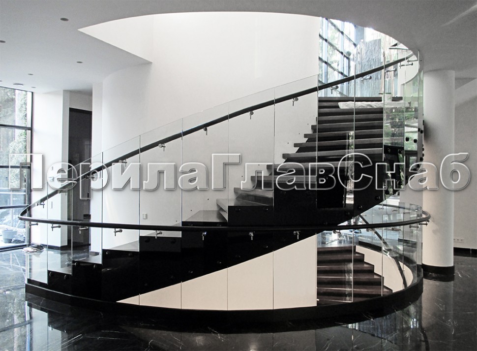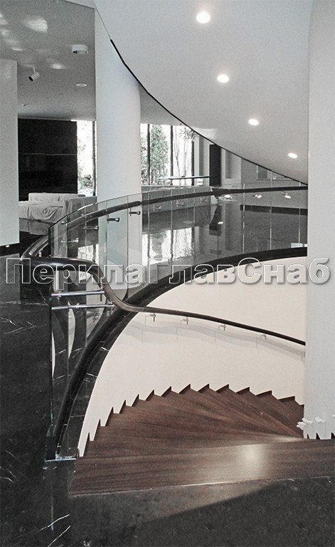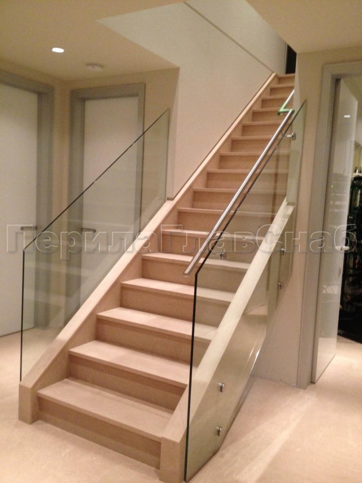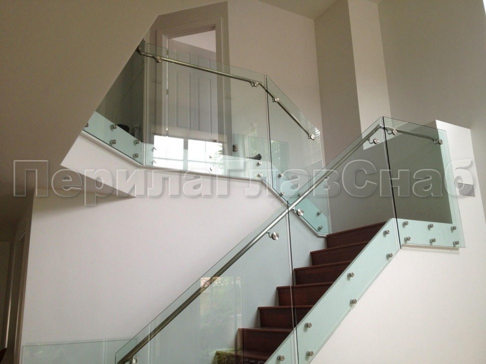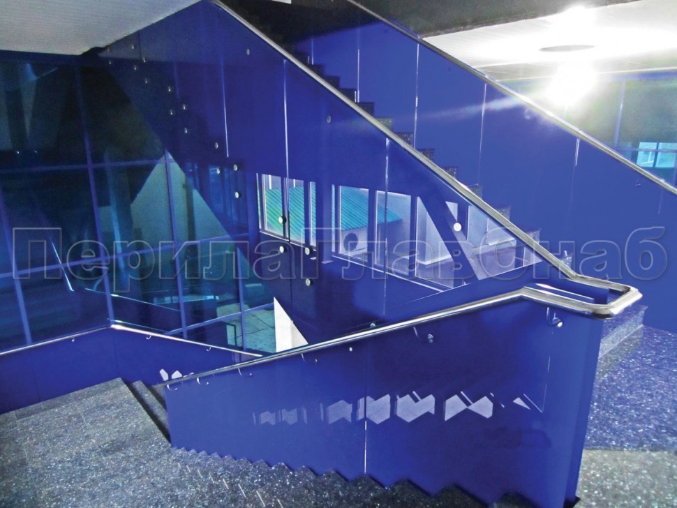 Ограждение с профильным поручнем с пазом на точечном креплении на лестнице