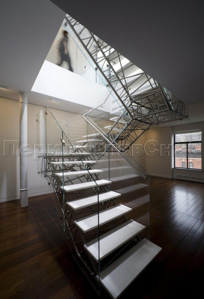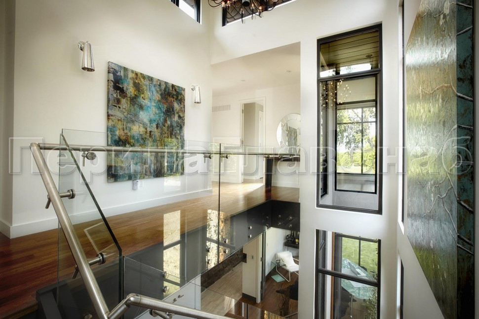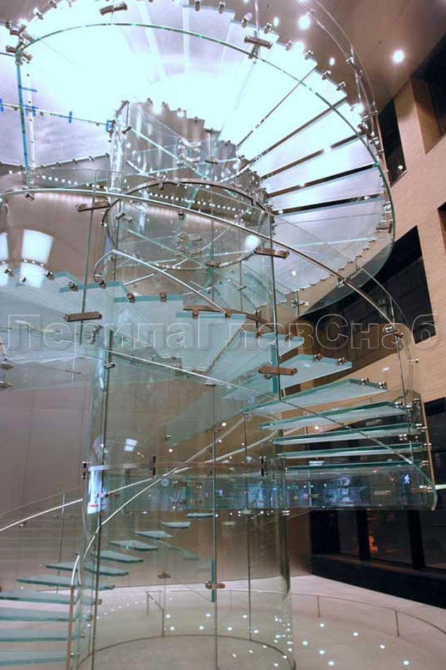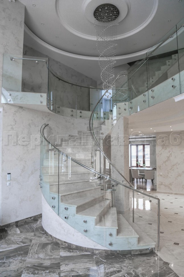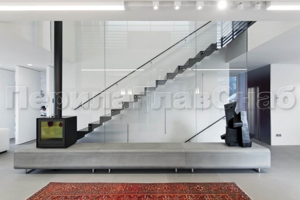 Ограждение с профильным поручнем с пазом на точечном креплении на лестнице