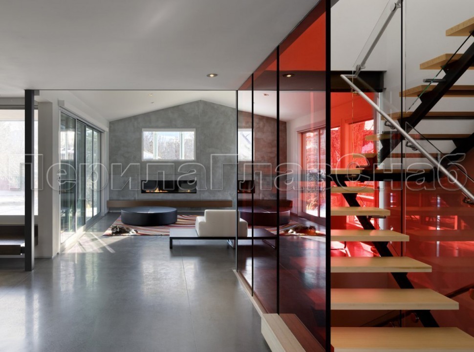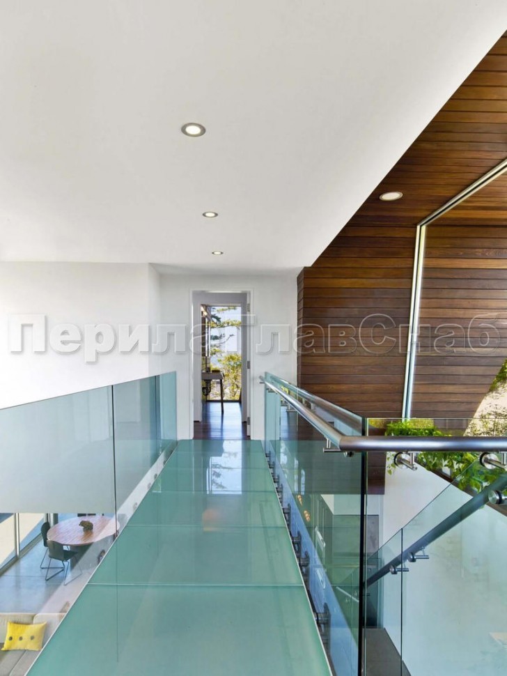 Ограждение с деревянным поручнем на точечном креплении на лестнице