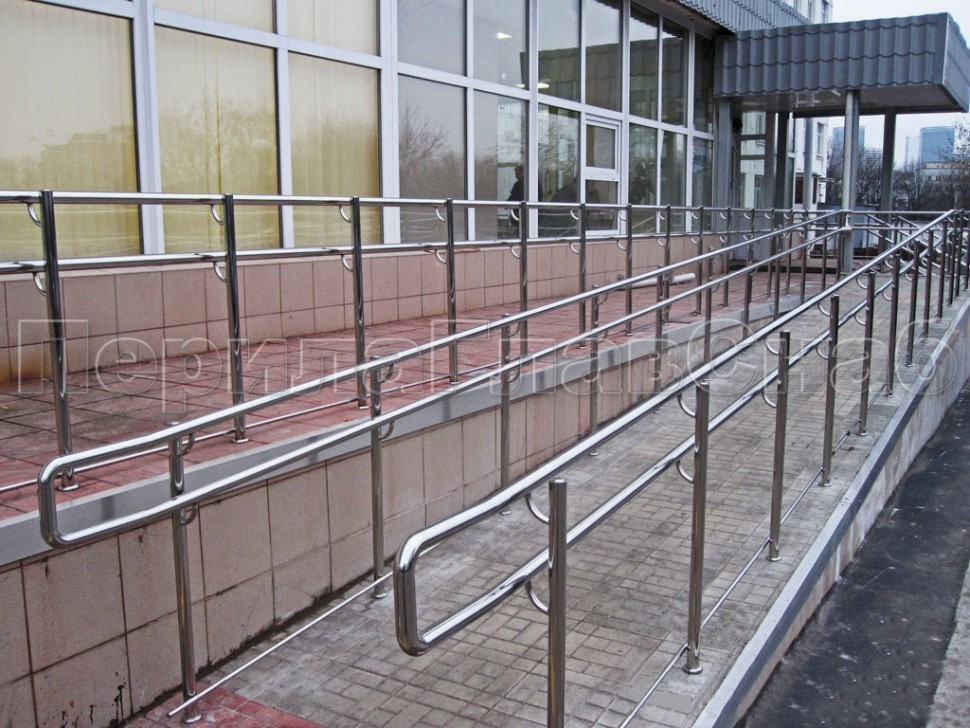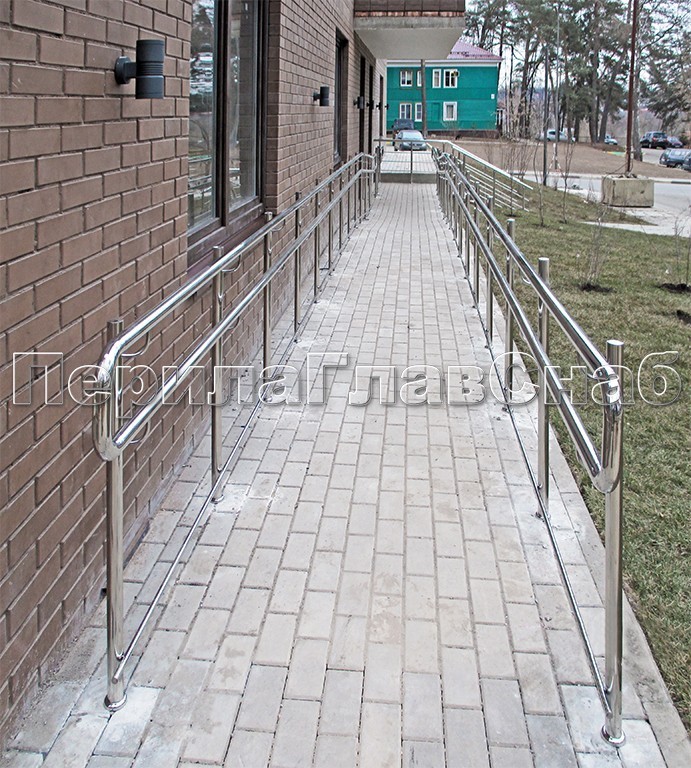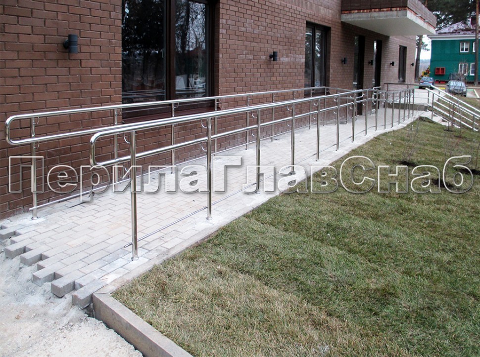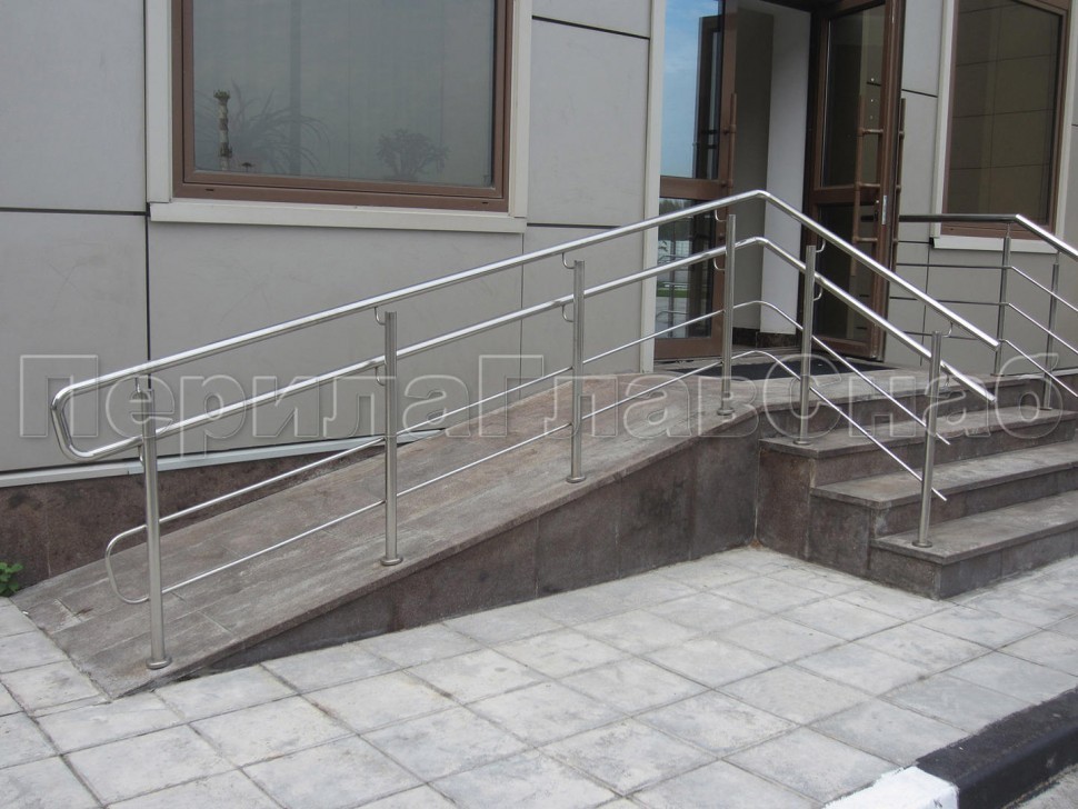 сдвоенный, из круглой нержавеющей трубы диаметром 38,1 мм. Нижний и верхний поручни завязаны при помощи отводов. Поручень может крепиться на выносные держатели.