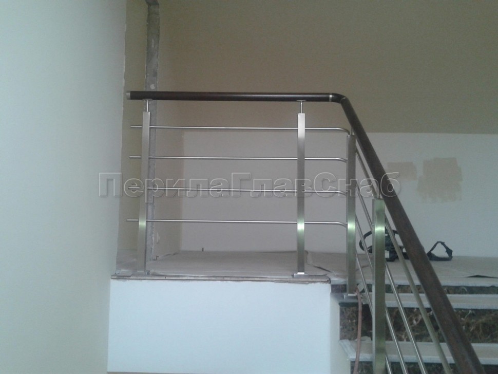 Три ригеля на сварке, квадратный деревянный поручень и круглые стойки