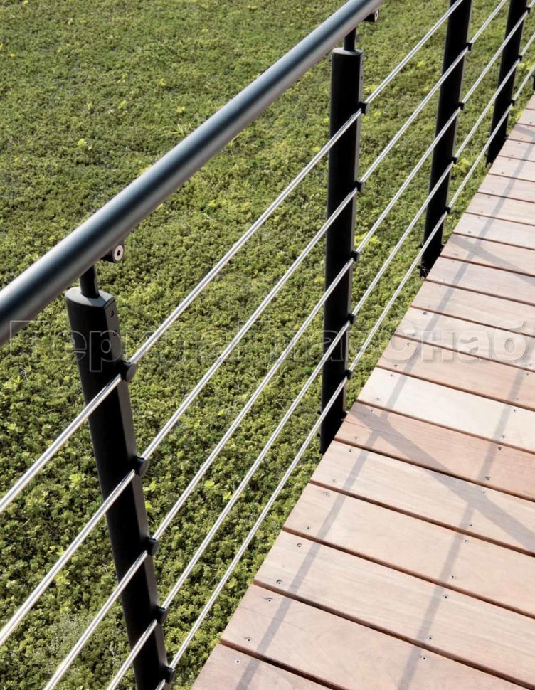Ограждения из нержавейки. Заполнение из 3х тросиков. Квадратные стойки.