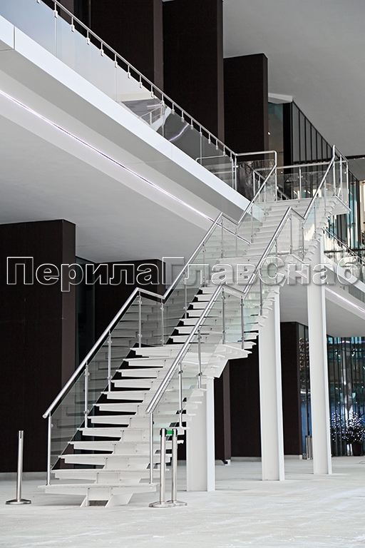 Ограждения лестницы без поручня с зажимными стеклодержателями и стойками в Симферополе. Готовые проекты ПерилаГлавСнаб
