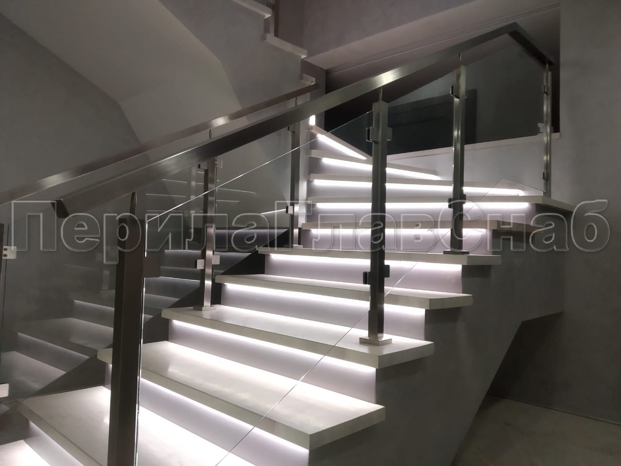 Ограждение лестницы с квадратными стойками и пластинчатыми стеклодержателями в Симферополе. Готовые проекты ПерилаГлавСнаб - фото 1 Ограждение лестницы с квадратными стойками и пластинчатыми стеклодержателями в Симферополе. Готовые проекты ПерилаГлавСнаб - фото 2