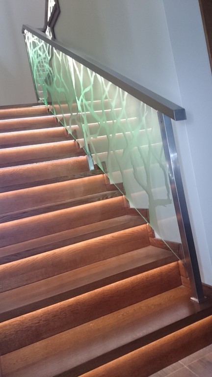 При использовании пластикового поручня подсветку лучше всего установить на стойки или точечно в стеклодержатели.